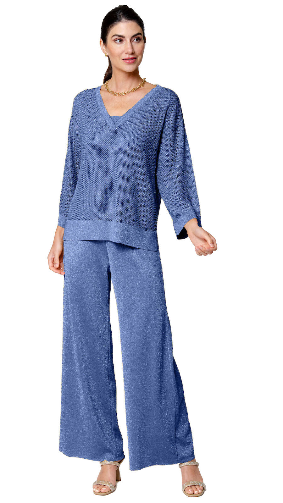 Oversized V-neck mesh top.  3/4 sleeves. The back is a couple of inches longer.  The fabric is light and rich and has a silver lurex shimmer;