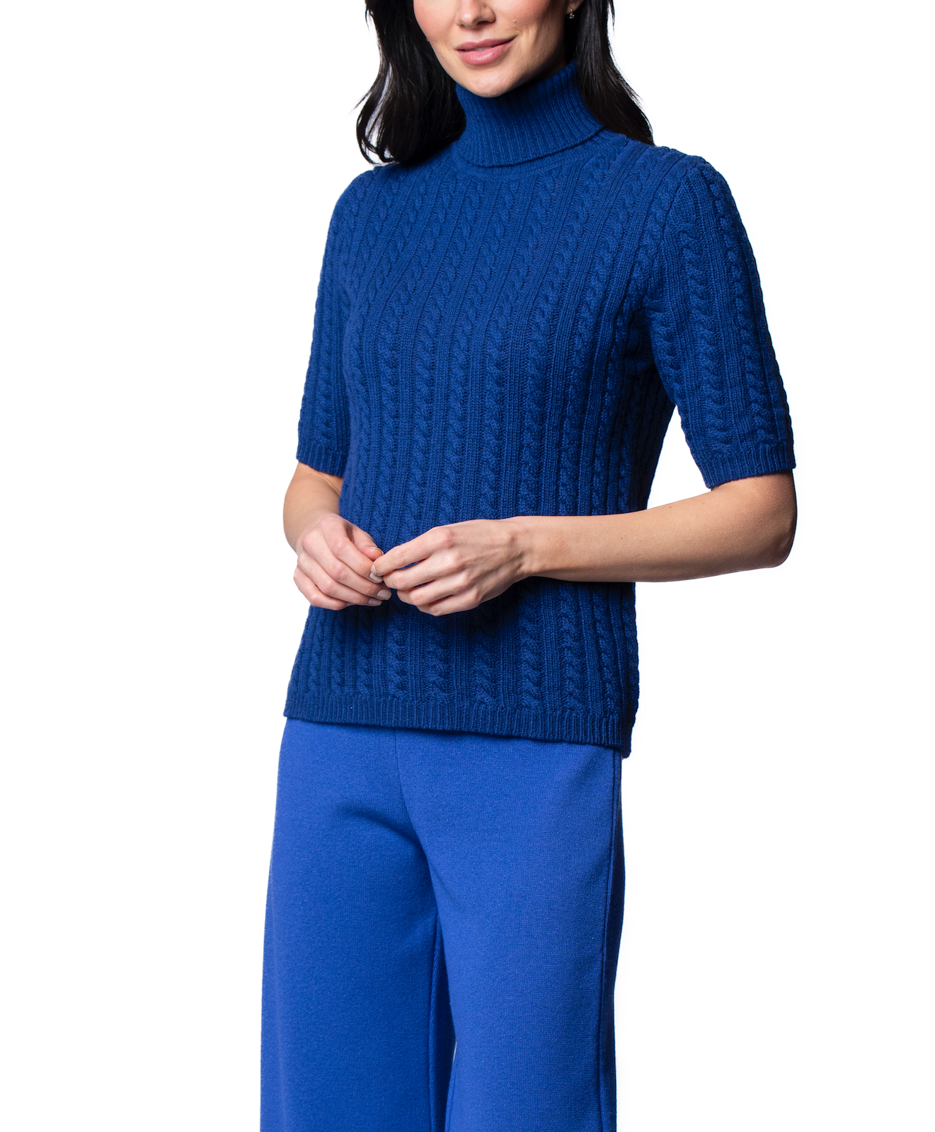Lilly Short Sleeved Cable-Knit Turtleneck, Dark Royal Blue