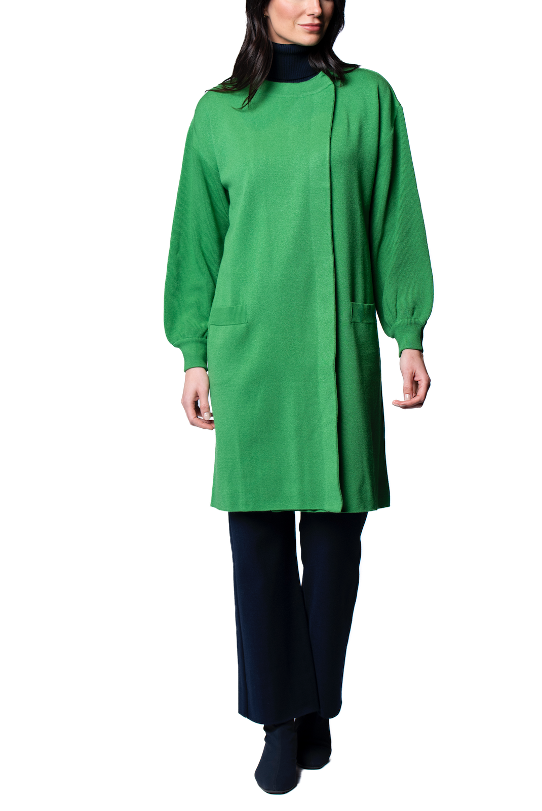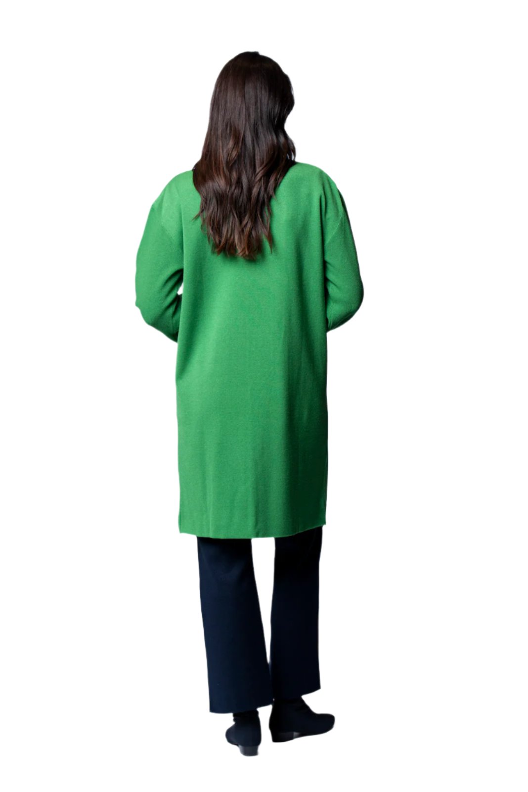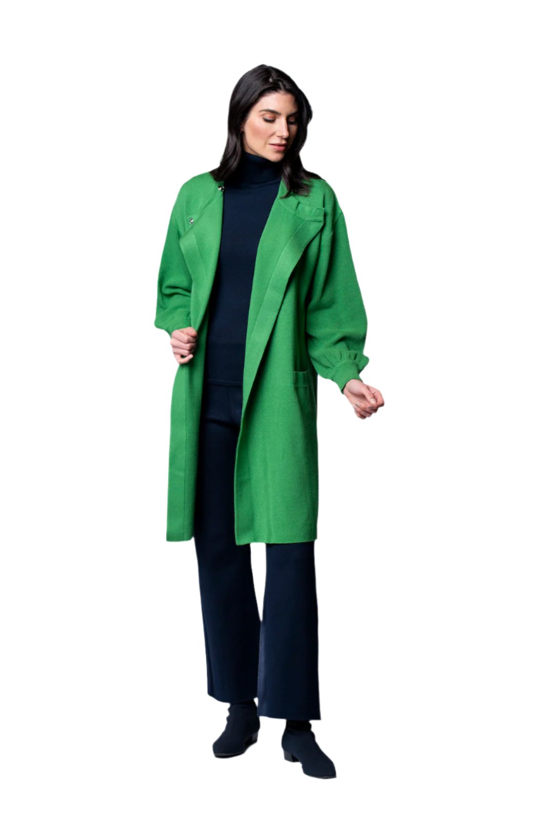 Milano-Knit car coat with overlapping front and slight bouffant sleeves. Hidden large metal tic tac buttons.
