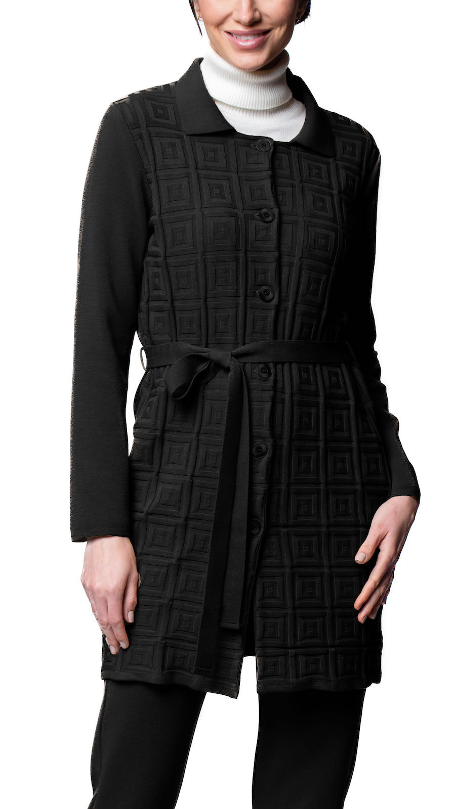 Square-detail knit Car Coat with a belt;  Flat-knit back and sleeves; Collar; Buttons;  Made of high-stretch supple viscose blend;