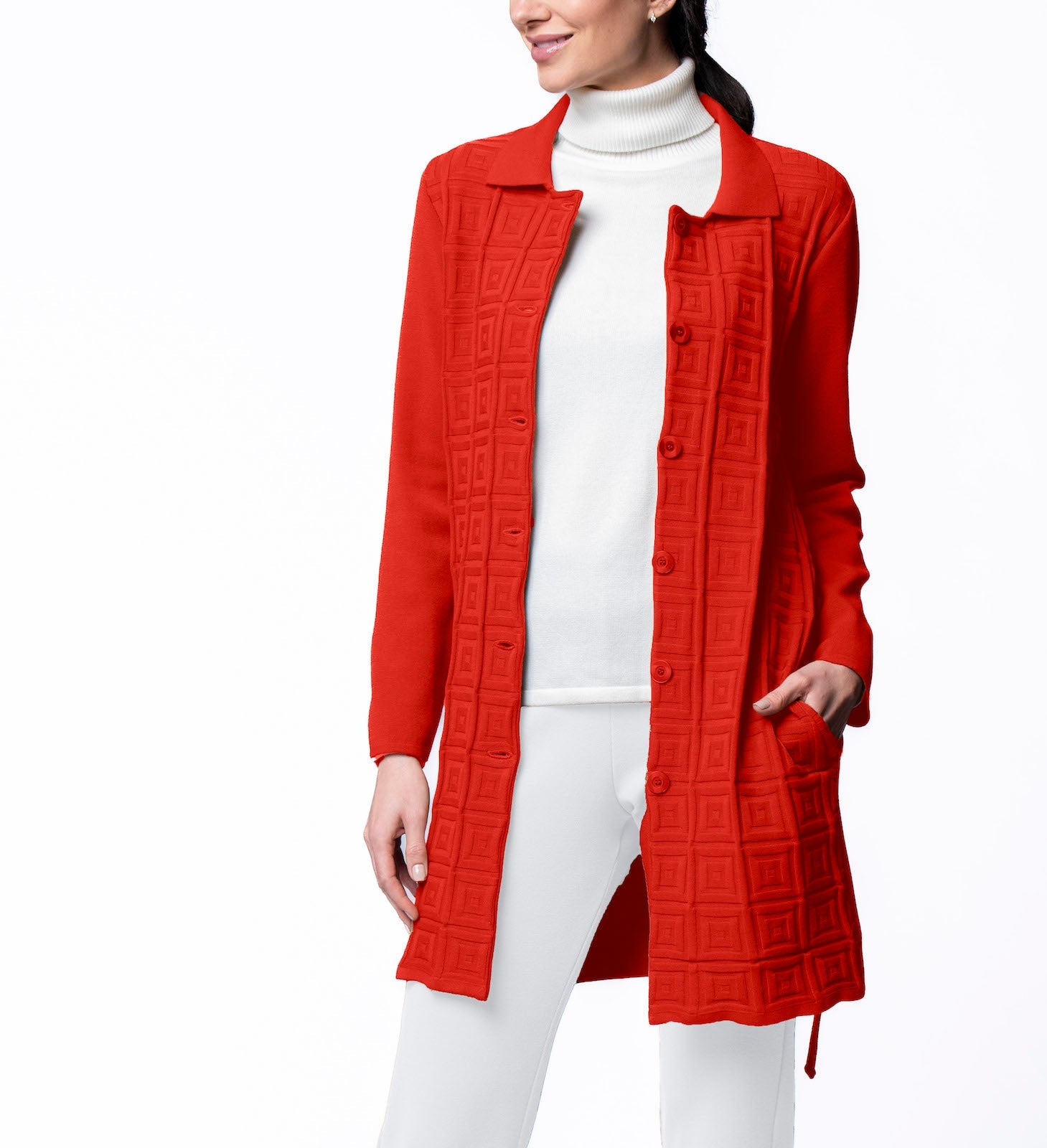 Square-detail knit Car Coat with a belt;  Flat-knit back and sleeves.  Collar; Buttons;  Made of high-stretch supple viscose blend;