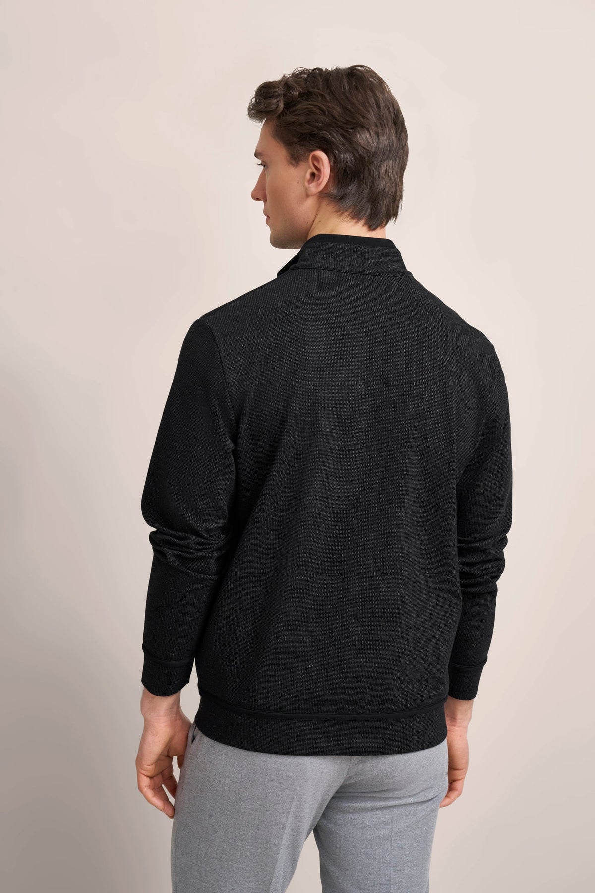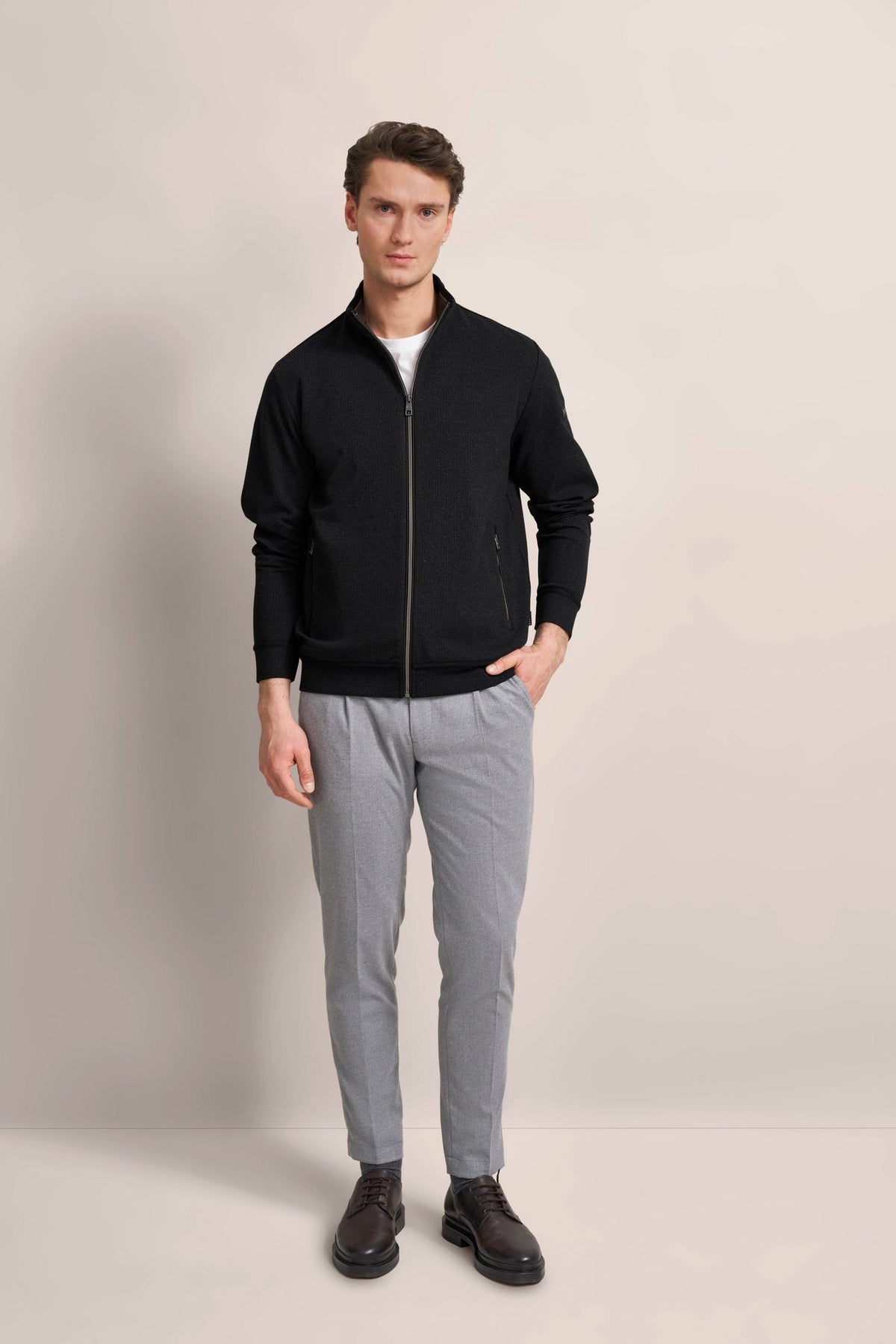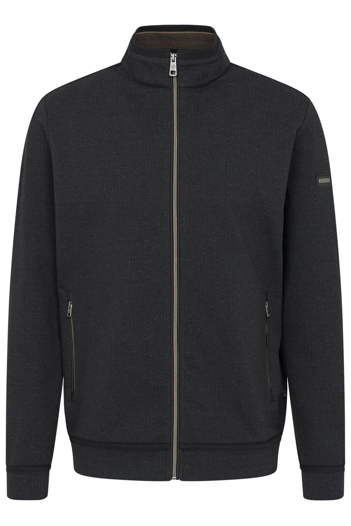 The Bugatti sweater jacket offers a refined blend of style and comfort with its lightweight cotton-elastane fabric. Designed for a modern fit, it provides flexibility and a close silhouette. Features include a stand-up collar for a contemporary look, colorful accents on the zippers and inner collar, practical side pockets, and ribbed cuffs to ensure a secure fit. This piece blends functionality with sophisticated detailing for everyday wear.