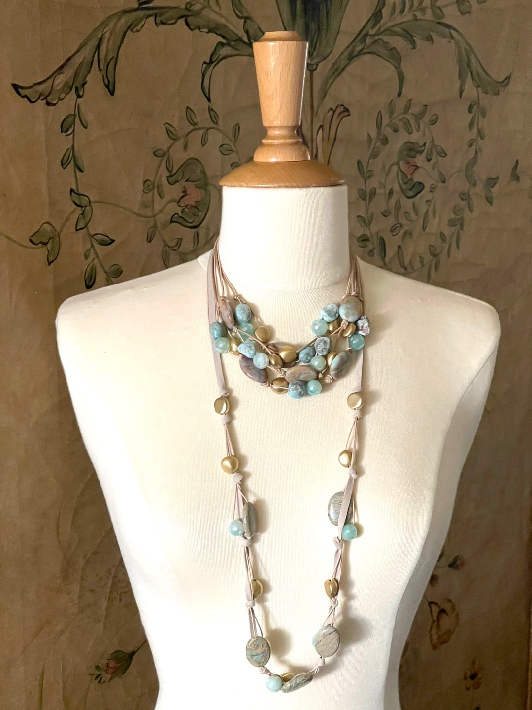 Blue Aqua Terra and Aqua Glazed Agate Matte Gold Natural Suede Layer Necklace