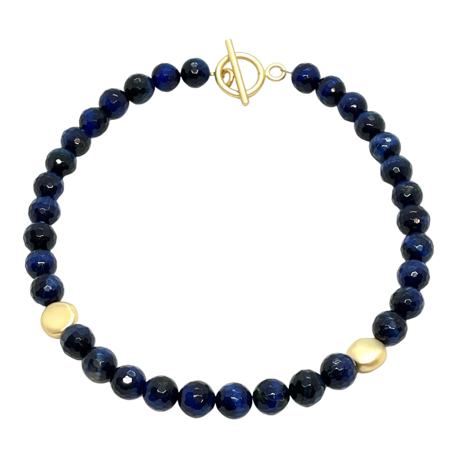 This necklace features striking Blue Tiger's Eye stones paired with subtle matte gold bead accents.