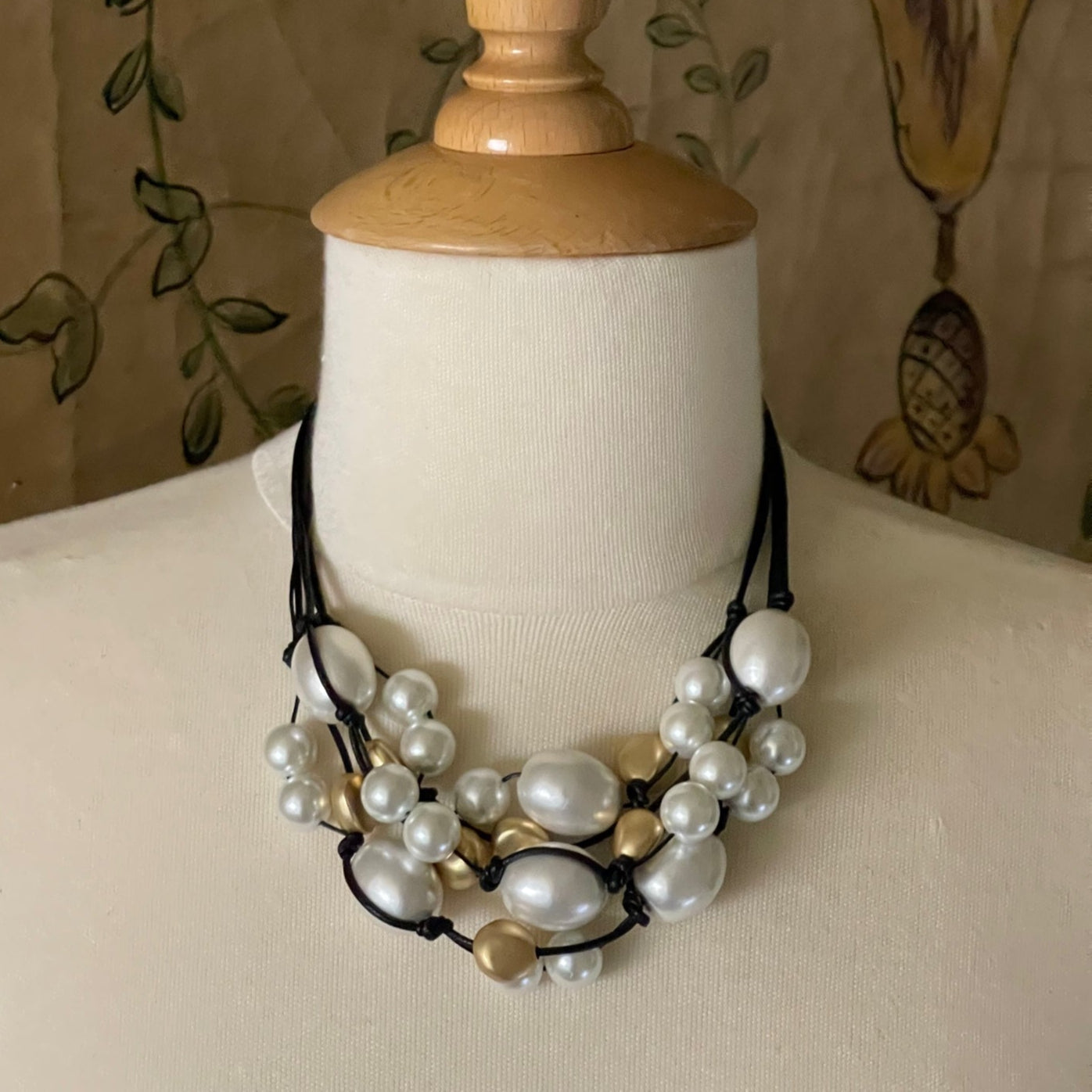 Cotton Pearl, Glass Pearl Matte Gold Pebble Bead Black Leather And Waxed Linen Three Strand Torsade Style Necklace
