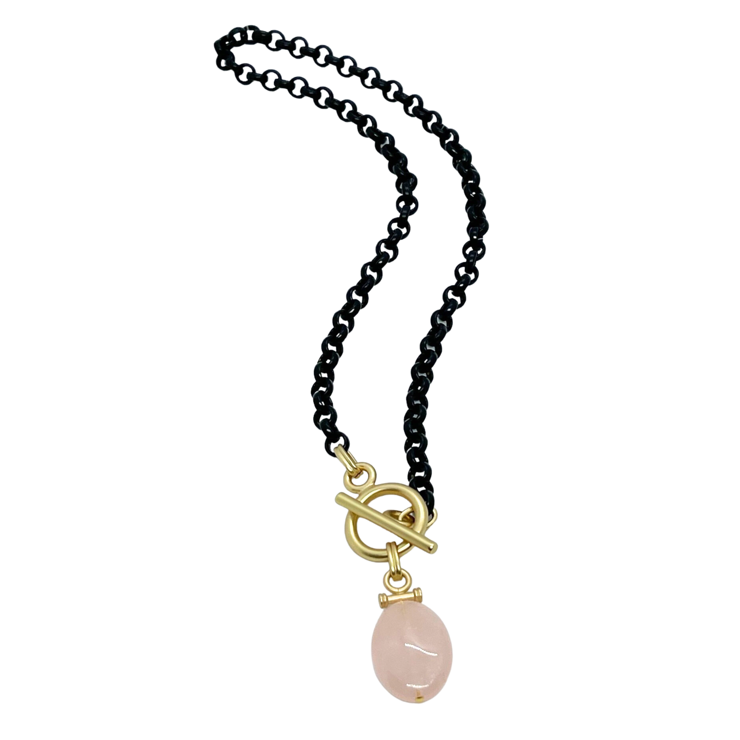 This elegant Rose Quartz pendant on a sleek matte black chain is the perfect addition to any outfit. The Rose Quartz stone is known for its calming and healing properties, promoting love and compassion. With its minimalistic design, this pendant is perfect for any occasion.