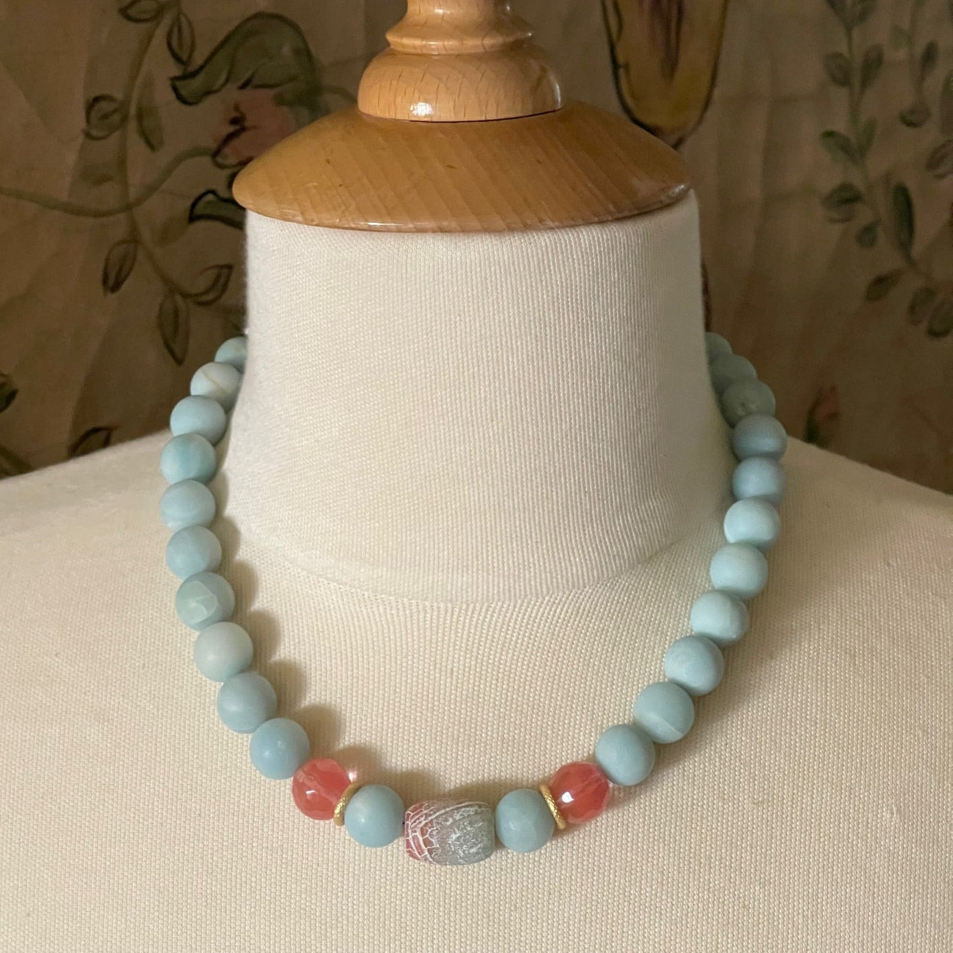 Watermelon Quartz and Amazonite with Fire Agate Center Beaded Necklace