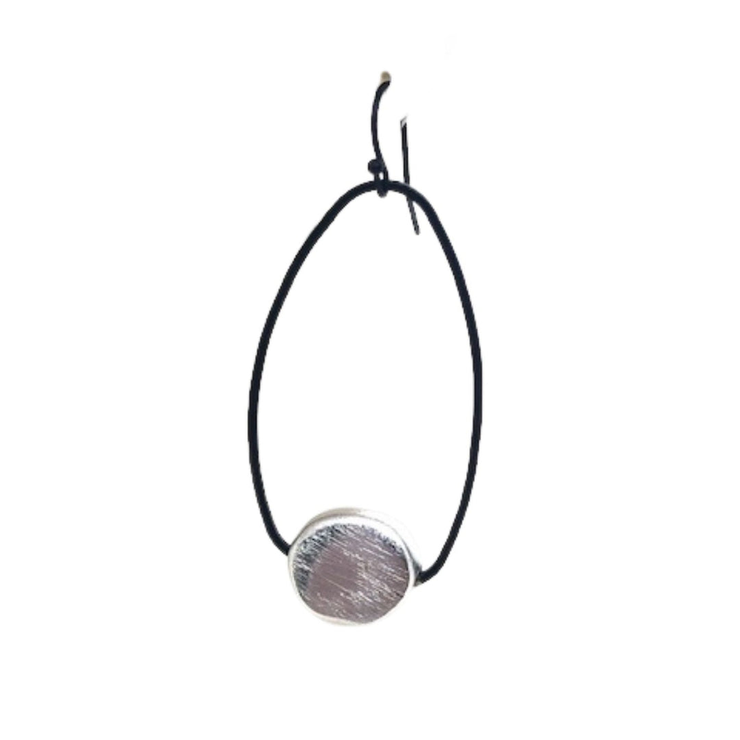 Matte Silver Flat Nugget Inset Oval Black Hoop Earrings