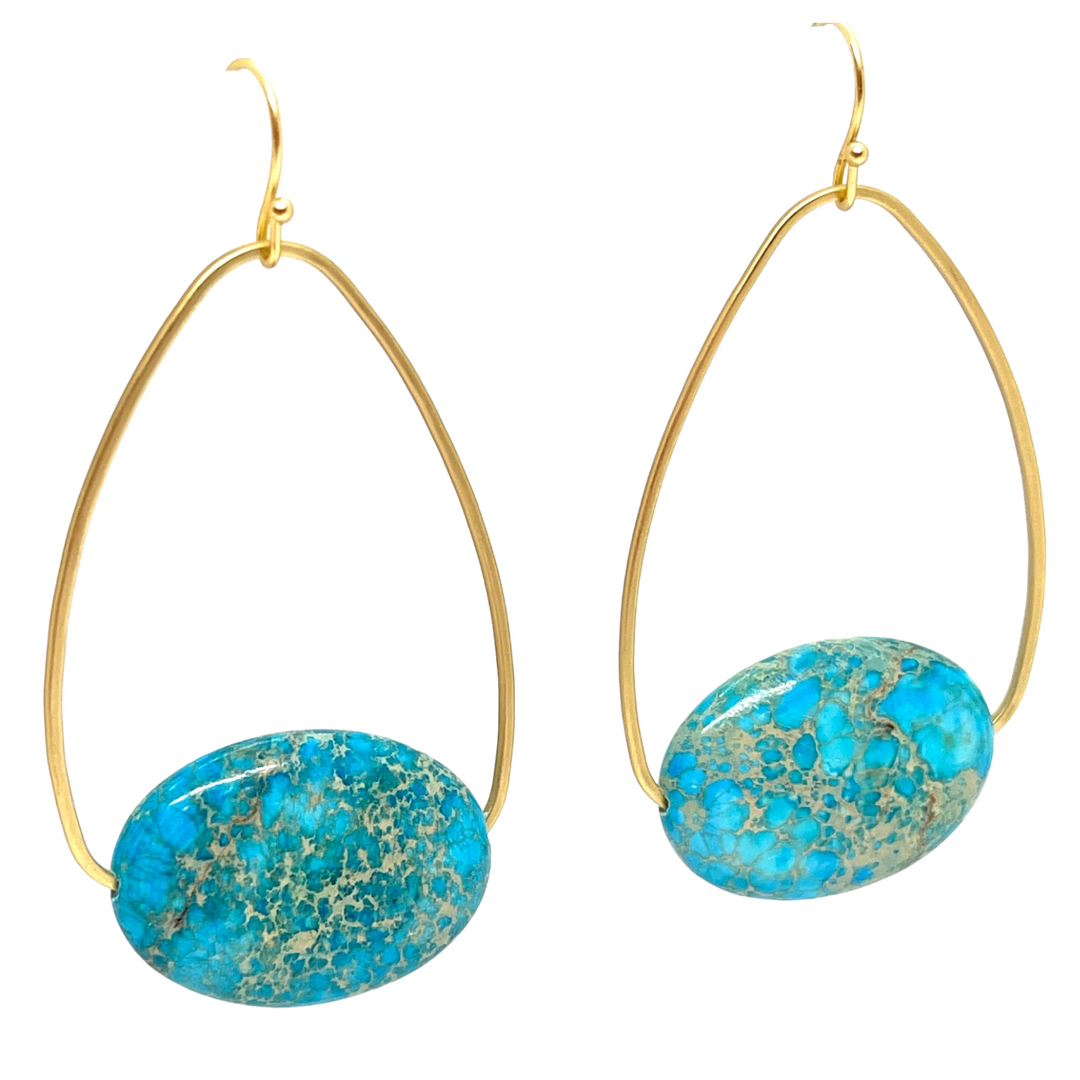 Turquoise Aqua Terra Inset Matte Gold Oval Hoop Earrings