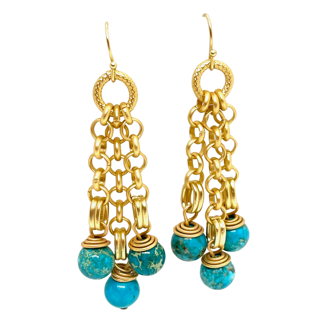 Turquoise Aqua Terra Three Strand Matte Gold Rolo Chain Earrings