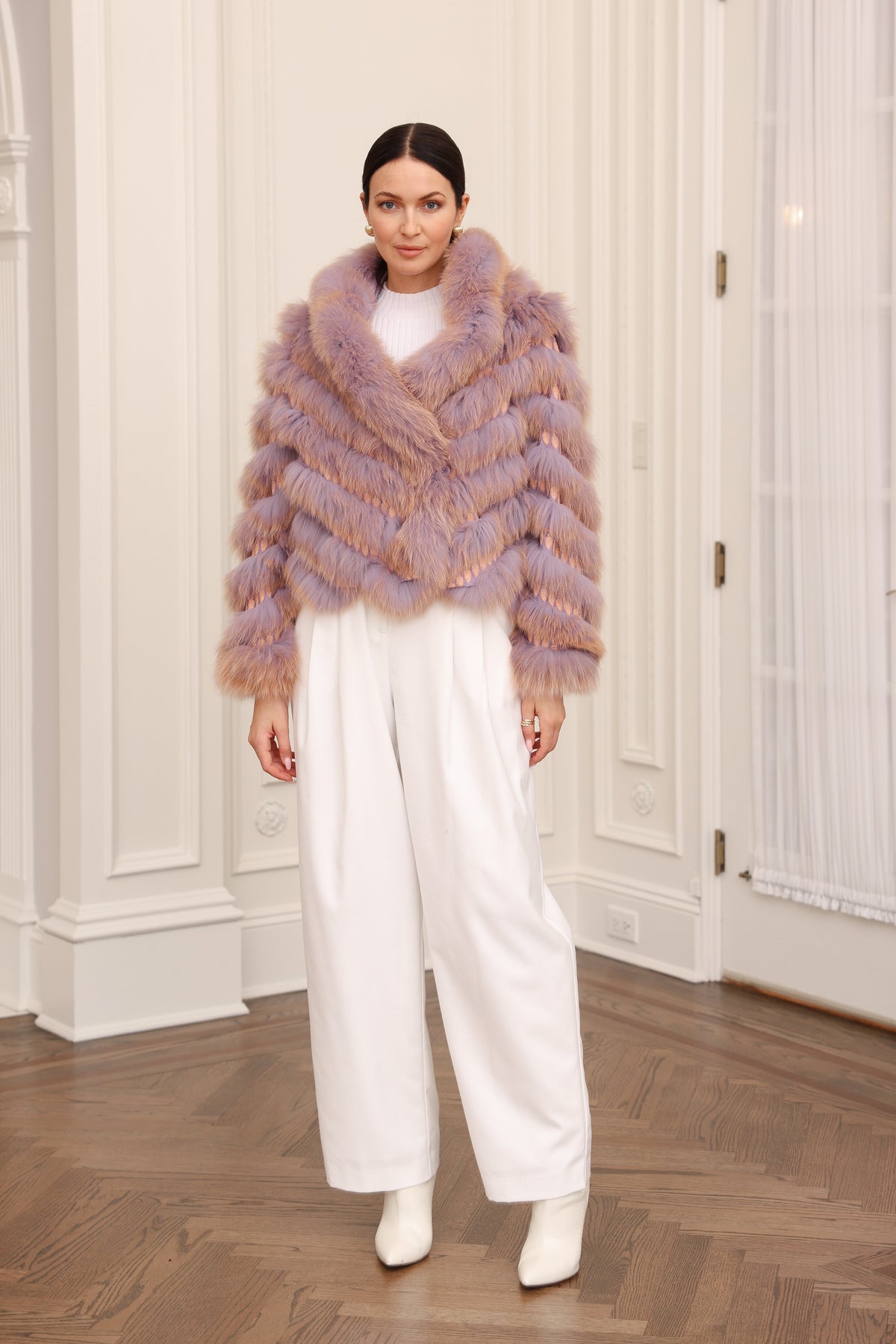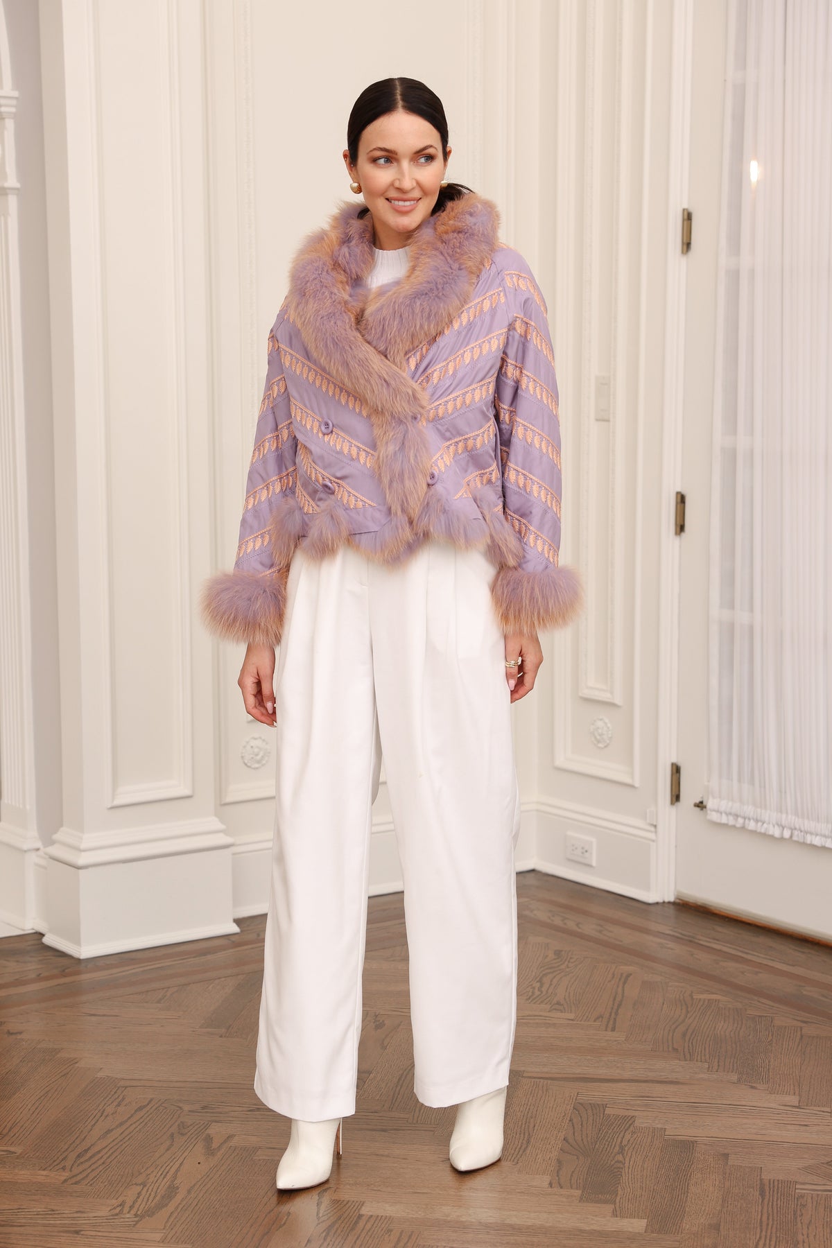This jacket offers a bold style with a feminine touch. Crafted from fox fur with silk fabric, it is incredibly lightweight, comfortable, and breathable. The design features an open collar for added versatility, along with embroidered details, a cropped cut, and button fastening, contributing to its sleek, modern silhouette. Easy to wear and pair with various outfits, this feather gilet is versatile enough to be styled both sophisticatedly and casually.