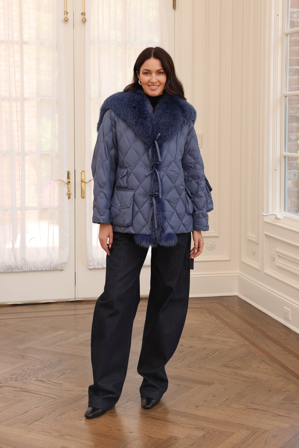 An elegant sailor-inspired jacket combines all-weather protection with a down jacket crafted from matte technical fabric, featuring a wealth of clever details. This jacket includes a fox fur sailor collar and fur trimming that runs down the front opening for added warmth. The design also features bow tie embellishments for a secure and stylish closure. Additionally, it has slip side pockets and patch pockets on the sleeves for extra flair.