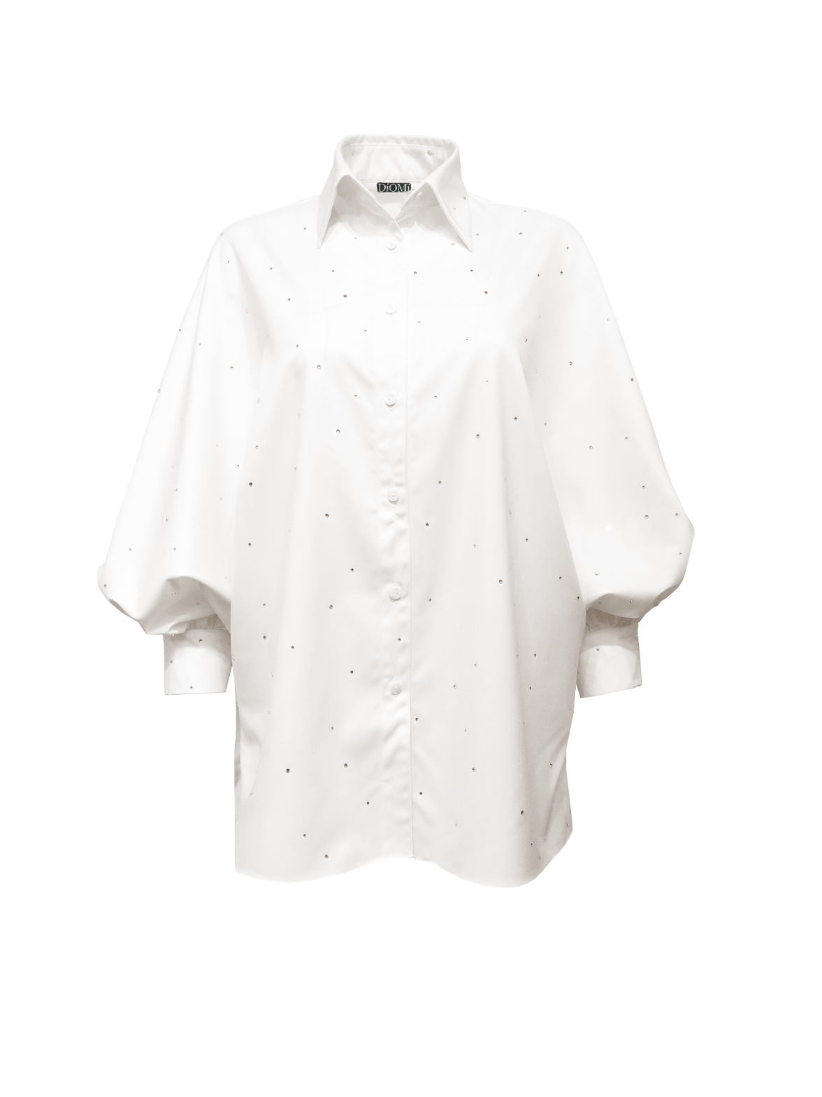 Elevate your wardrobe with this sophisticated Oxford blouse featuring elegant blouson sleeves and delicate white rhinestone embellishments. The classic silhouette offers versatile styling options while the premium fabric ensures comfort throughout the day. Perfect for professional settings or upscale casual occasions when paired with tailored trousers or skirts.