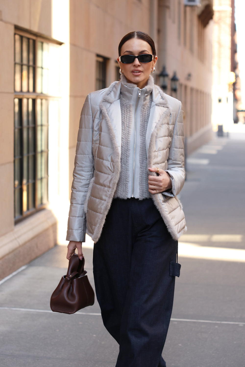 This classic mid-length jacket is made from waterproof nylon and features light padding in a slim-fit design. It has a lapel collar adorned with fur trimming and combines sleek lines with high performance. The jacket also includes a removable inner bodice that boasts luxurious, sustainable mink fur trim, which can be detached on warmer days.