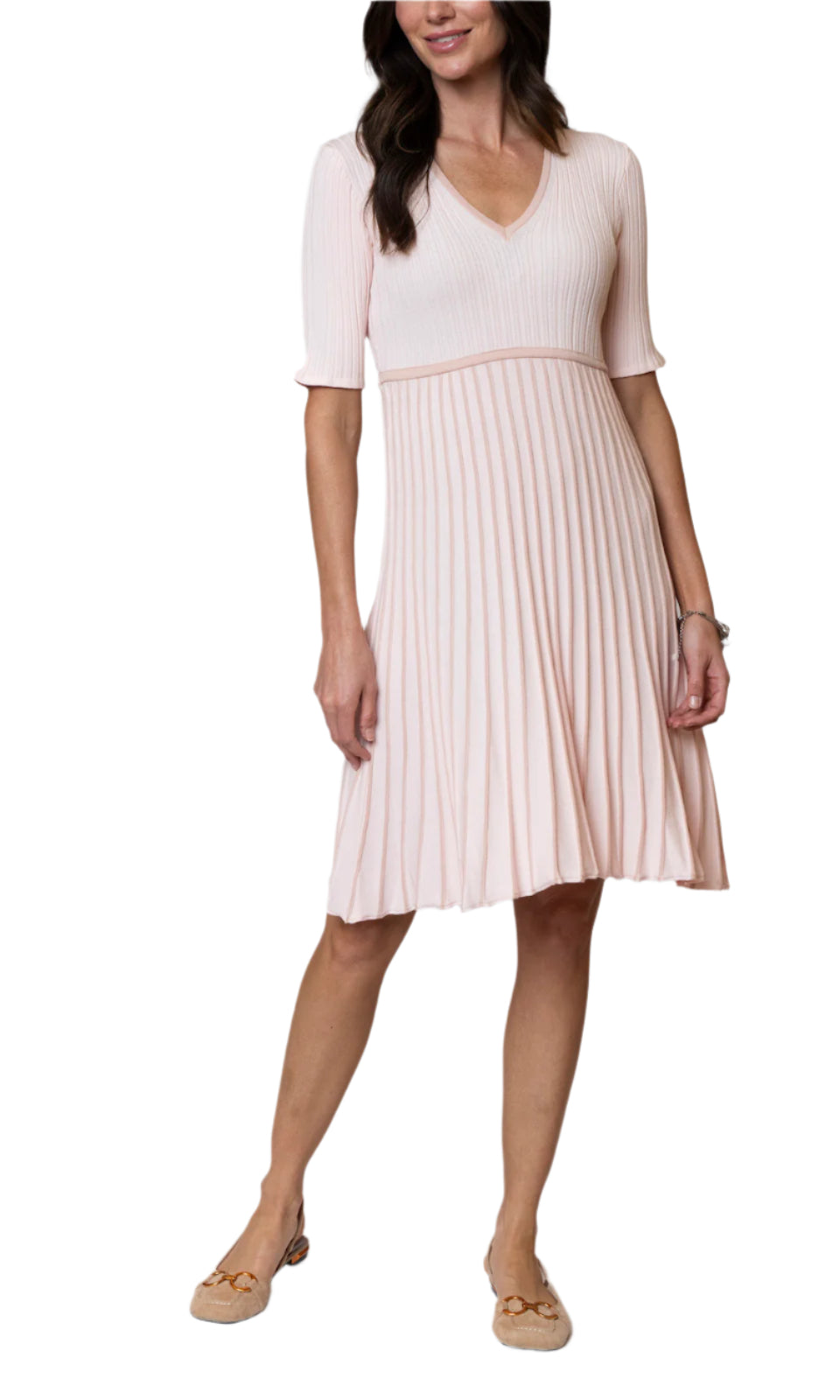 Pleated Short Sleeved Dress; Empire waist; Knee-length; Made of high stretch supple viscose blend;