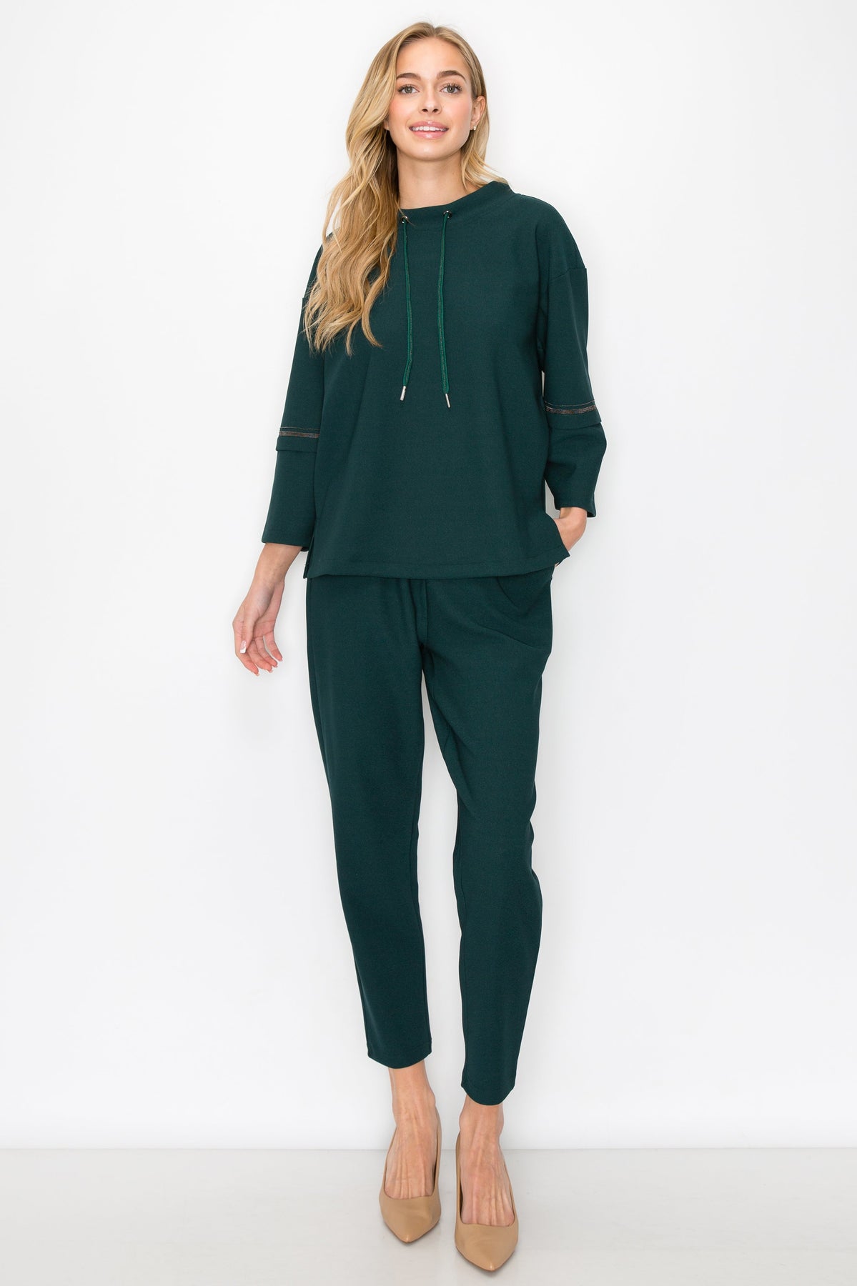 The Kayla. This stylish top is beautifully made with high quality stretch crepe knit. Bateau neckline with front ties. Contrasted with beading trim around the sleeves. Timeless and comfy.