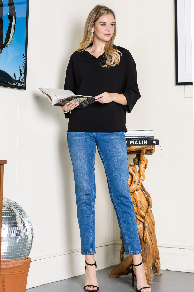 The Kourtney top. The perfect everyday wear. Made with high quality stretch crepe knit. Beautifully draped open front collar. Easy relax fit. Stylish and comfy. Don't miss out on this one !