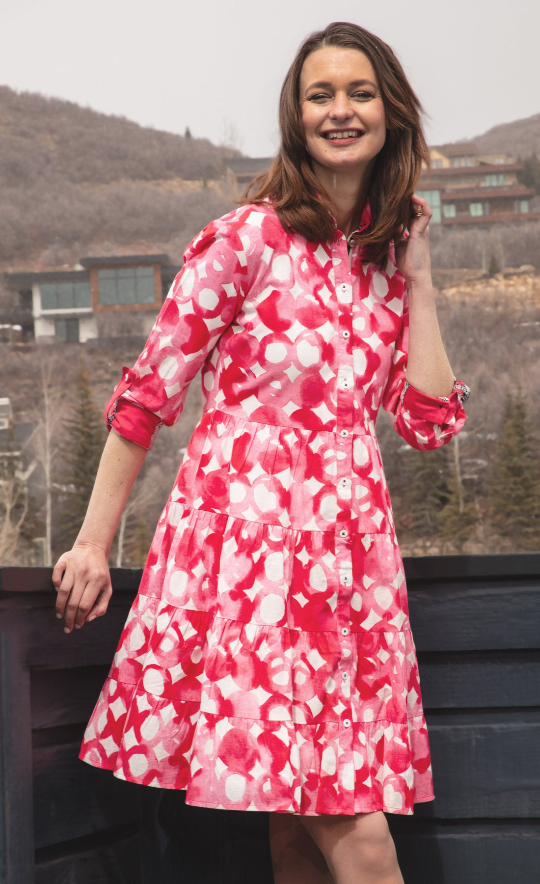 With its delightful pink hues and whimsical watercolor design, the Delray Dress dances with every movement, making it a perfect companion for sunlit strolls and afternoon picnics.