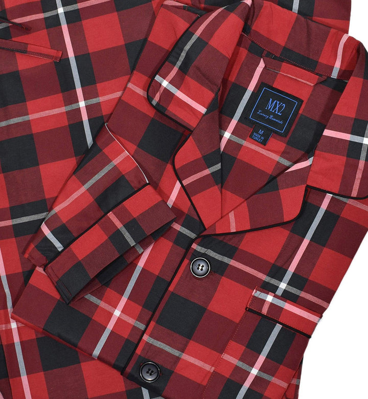 Our exclusive men's pajamas are made with extra fine cotton that is soft to the touch.  The result is a comfortable pajama that enhances you around the house lifestyle.  Soft cotton woven fabric. Traditional fashion pattern. Red with black plaid pattern.