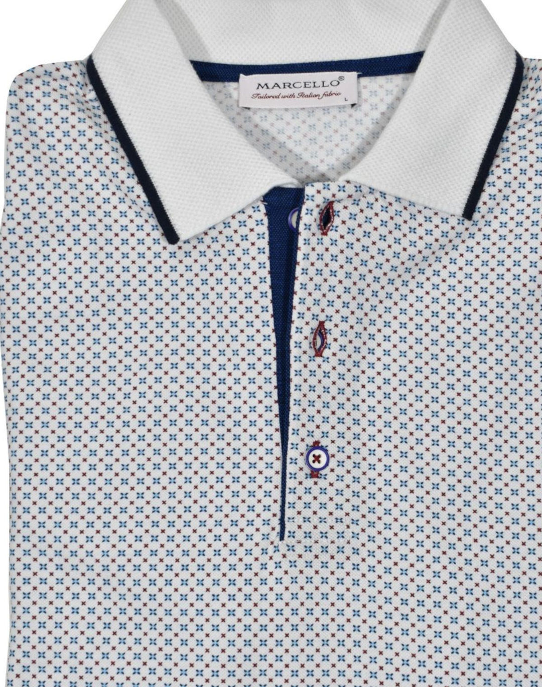 Soft, white, cotton pique fabric sporting a fine small geometric medallion in blue, teal and white colors, that creates a sophisticated clean image perfect for any setting.  Clean collar tipped in contrast color, custom buttons and contrast color fabric along the buttons.  Classic fit.