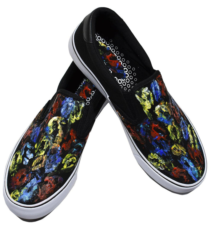 Accentuate your image with cool hand painted canvas slip on shoes.  The distinguished look will certainly get compliments.  The unique painted canvas is hand painted one by one with no two exact.