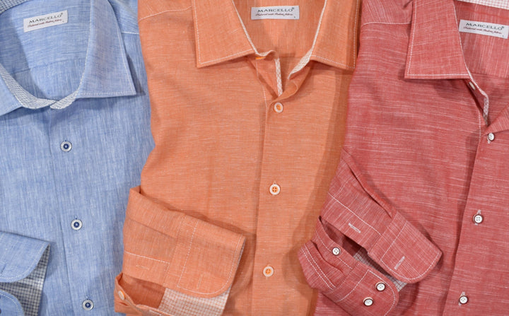We call it linen due to the look of the weave, however it is 70% cotton 30% linen.  Fortunately the look of linen without the wrinkling or negative traits.  Great colors to brighten your image, custom buttons, matched trim fabric and contrast stitching for a cool look.  Classic shaped fit.     Blue, Mango, Red, White (not pictured)