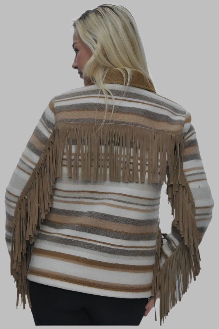 Looks like a classic horse blanket but fells like cashmere. Italian Melton fabric. Durable. Trimmed with real raw hide. Hard zipper and togo buttons for looks. Corduroy collar.  The western look with a high taste level. It will be your favorite outerwear item and you will be bombarded with compliments.