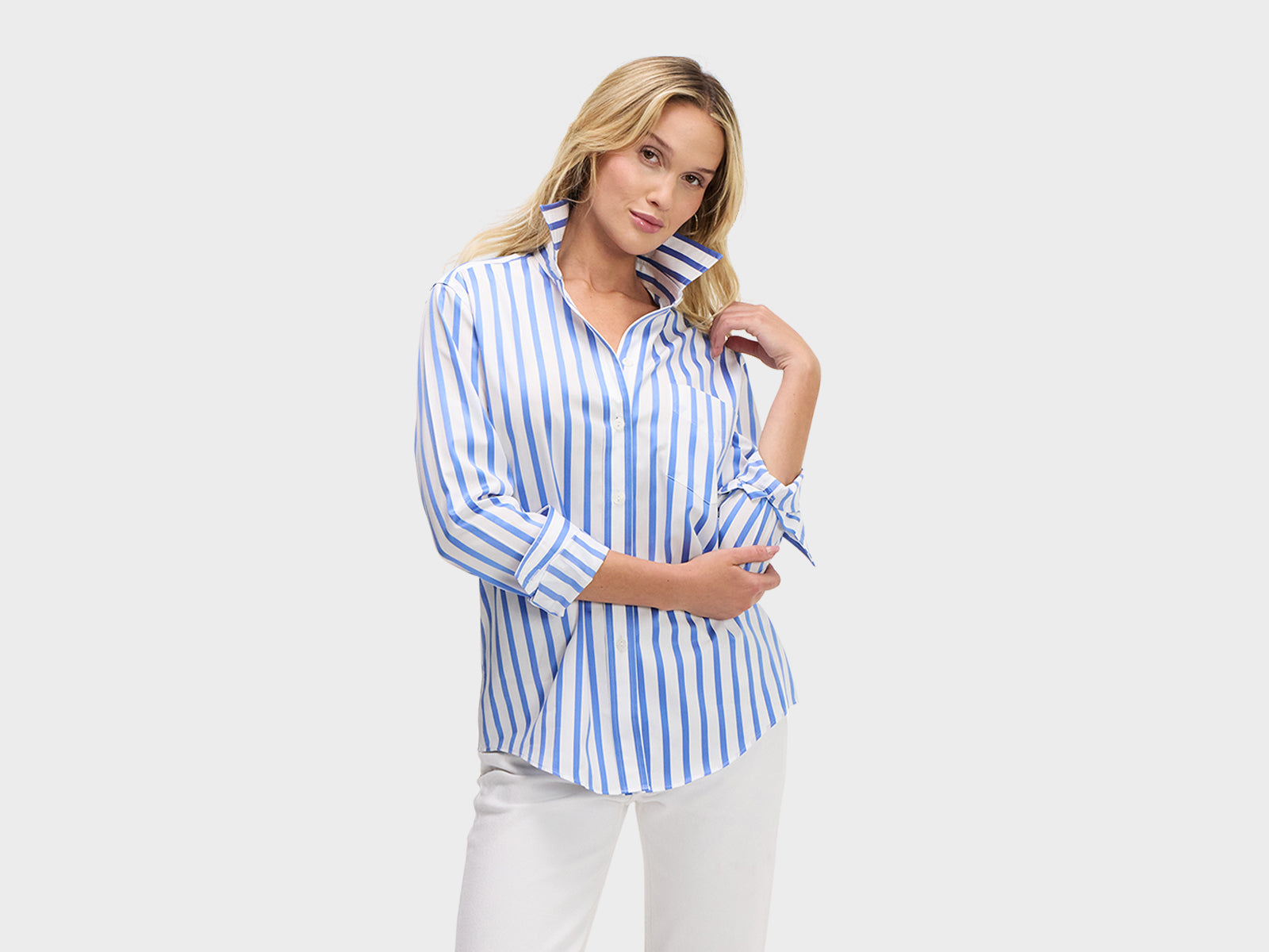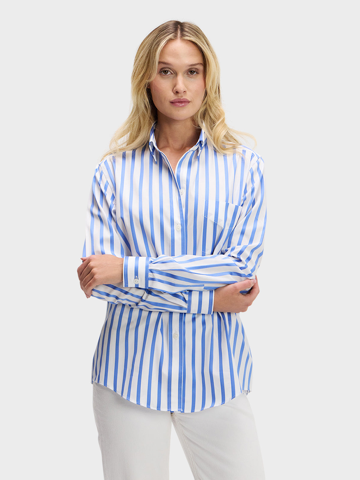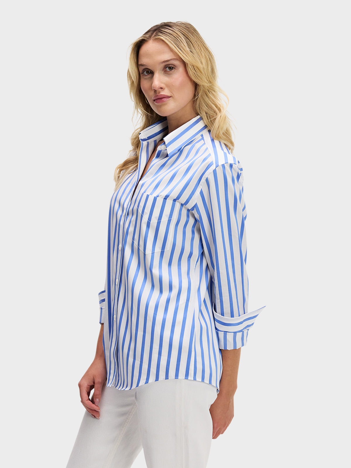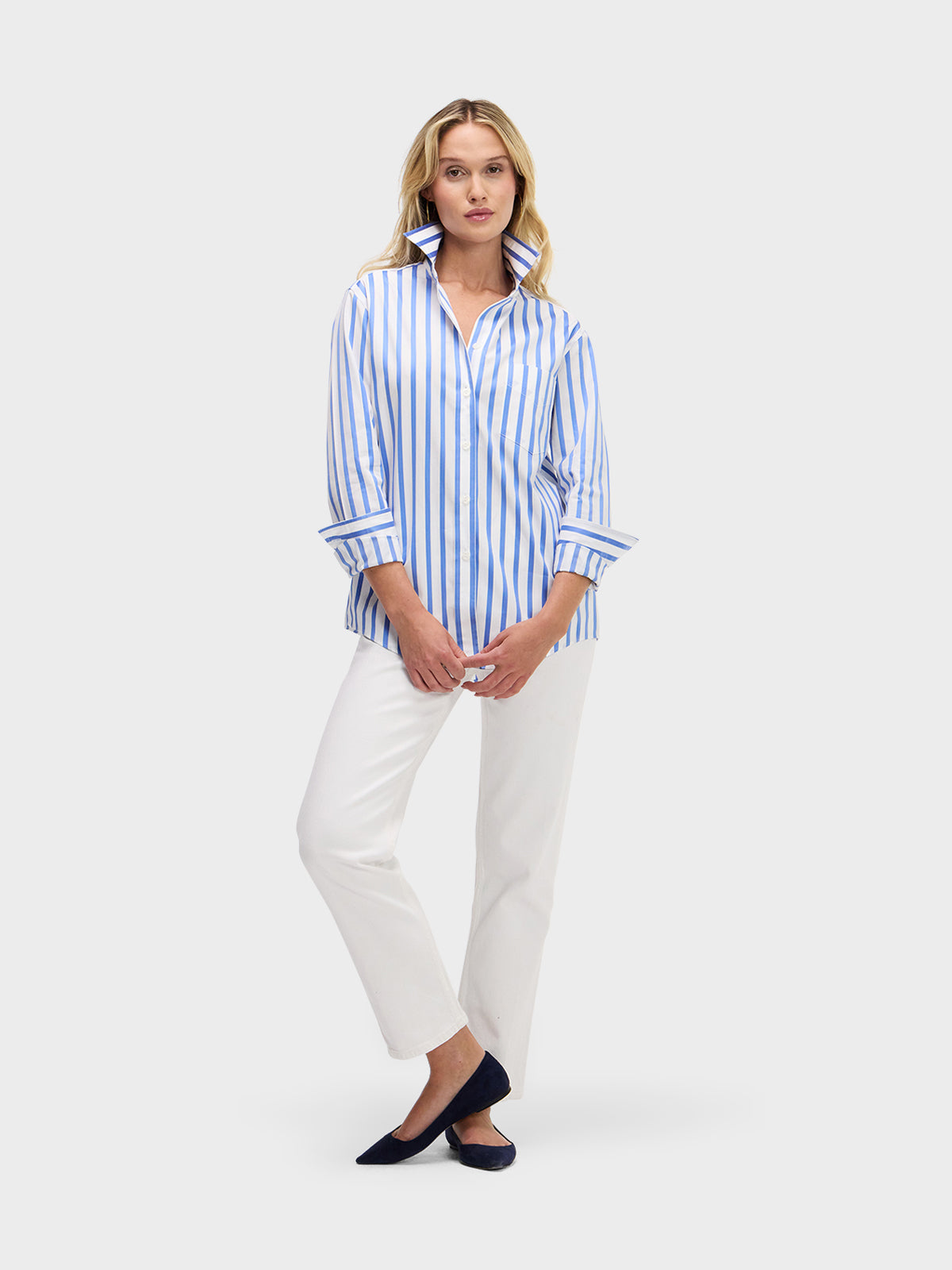 Our menswear inspired Weekend Shirt in a classic blue and white satin stripe.