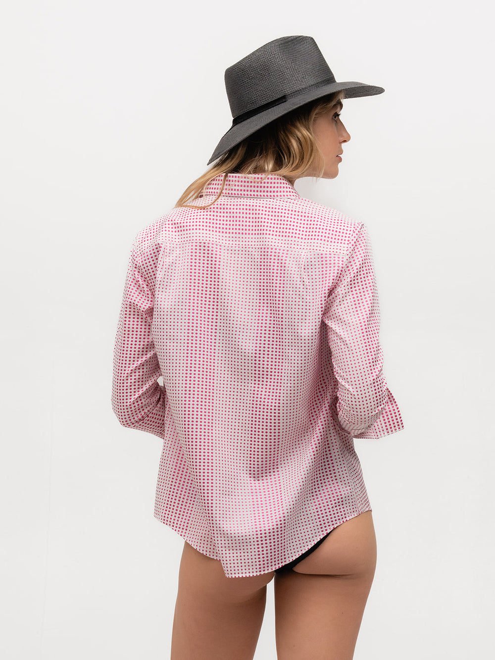 Our menswear inspired Weekend Shirt in a magenta gradient polkadot dobby.