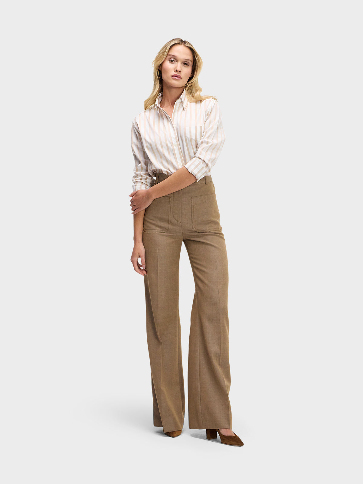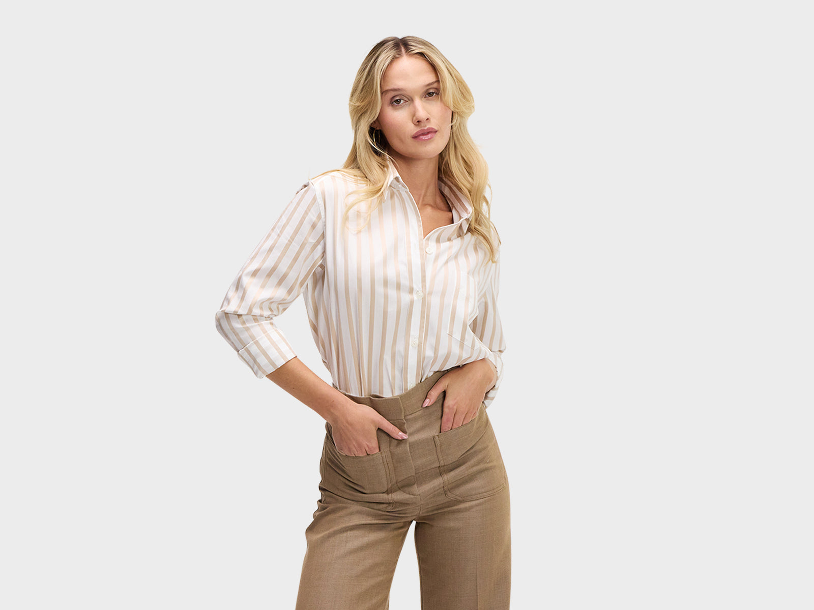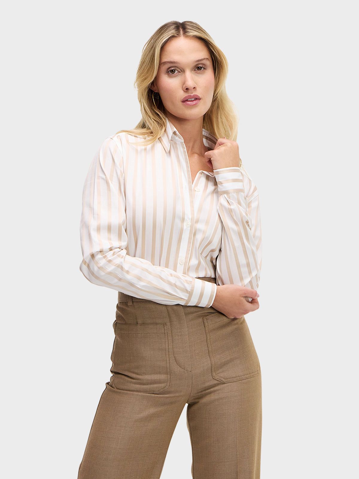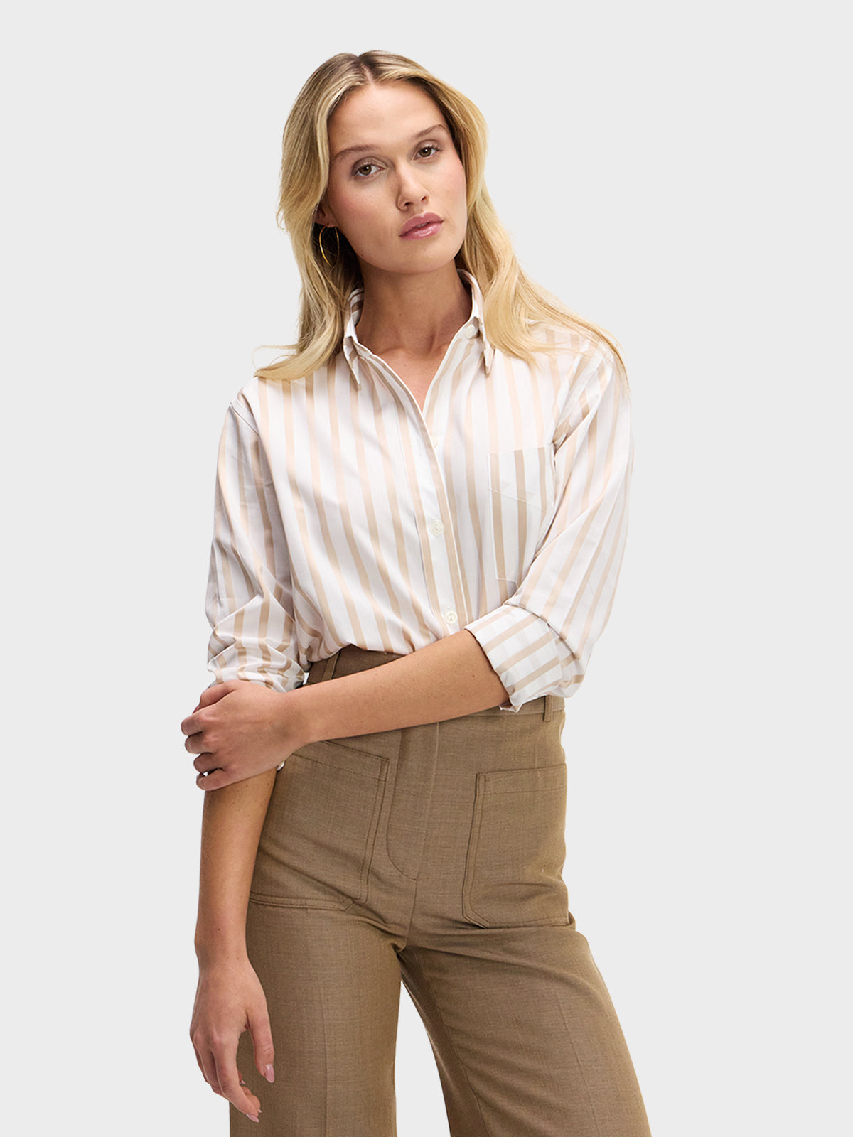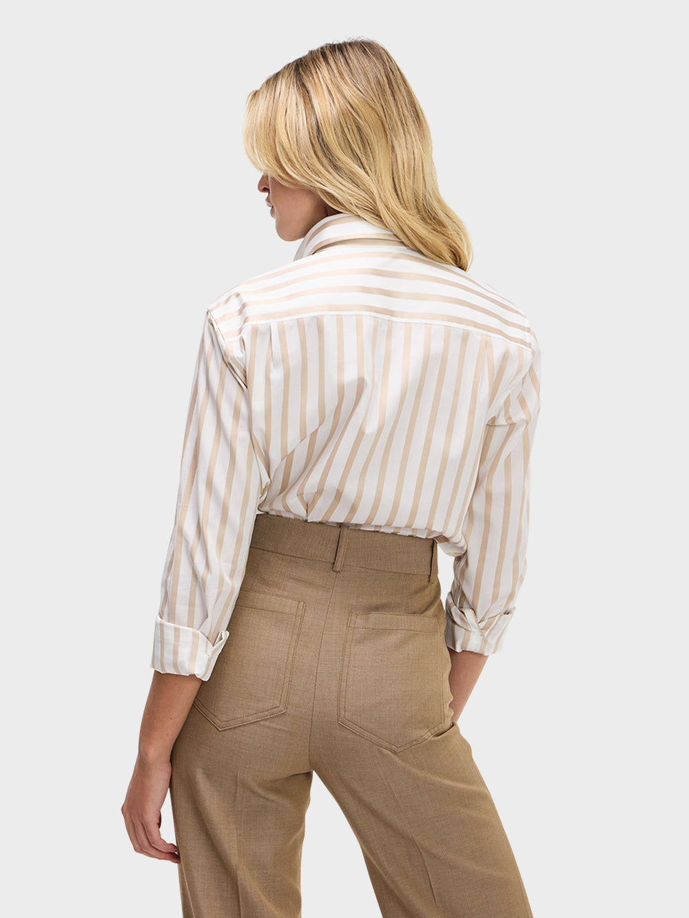 Our menswear inspired Weekend Shirt in a classic khaki satin and white stripe.