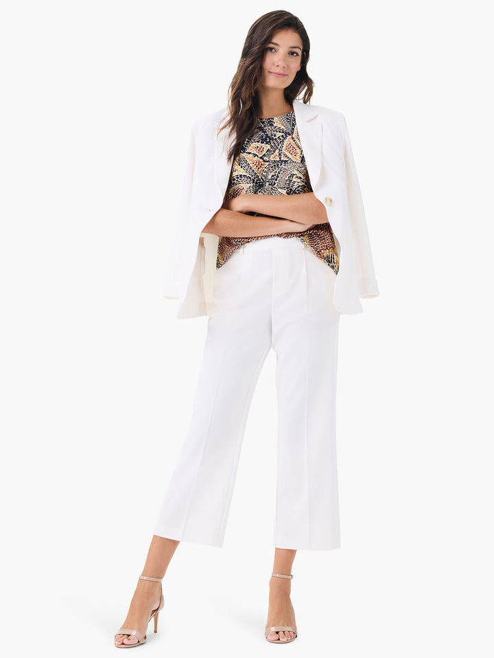 A dressier tank for social occasions or a quick throw on to elevate your favorite pair of jeans? The choice is yours. The print is a uniquely tessellated take on botanical, with sophisticated neutrals and black so you can wear it with black pants. The shape is timeless and contemporary with a boat neck in front and back to make things a little dressier. With just the right amount of stretch and a hem designed to sit at the hip.