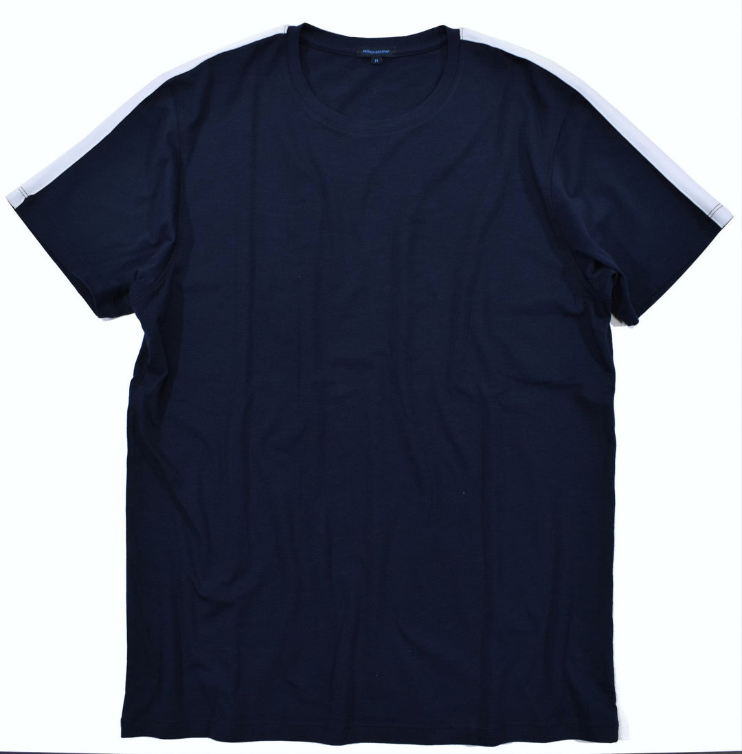 Super soft and rich Pima cotton fabric in a classic tee model with an accent white stripe on the shoulder and down the sleeve.  Open sleeve and side slit vents.  Simple fashion design by Assaraf Italy.  Classic shaped fit.