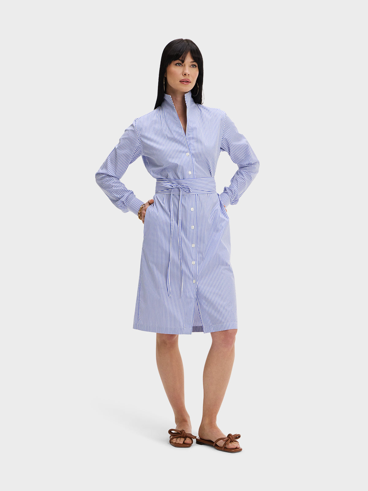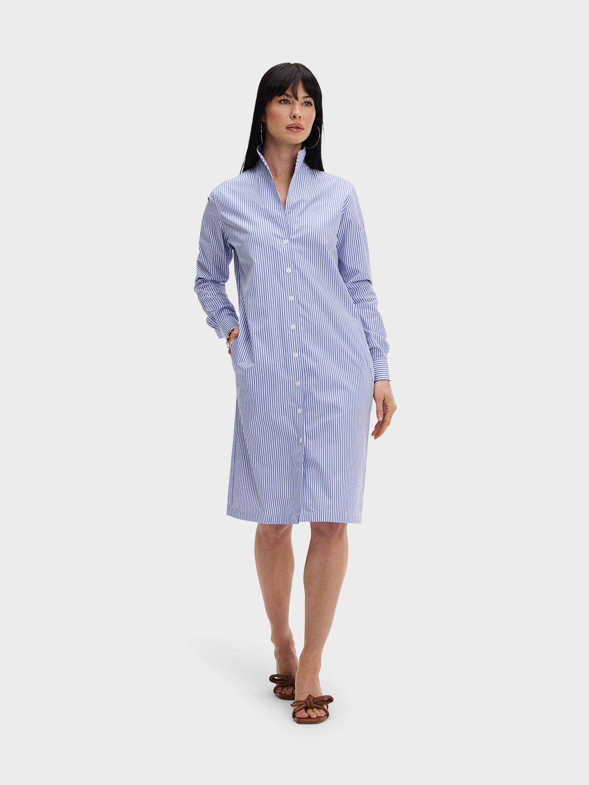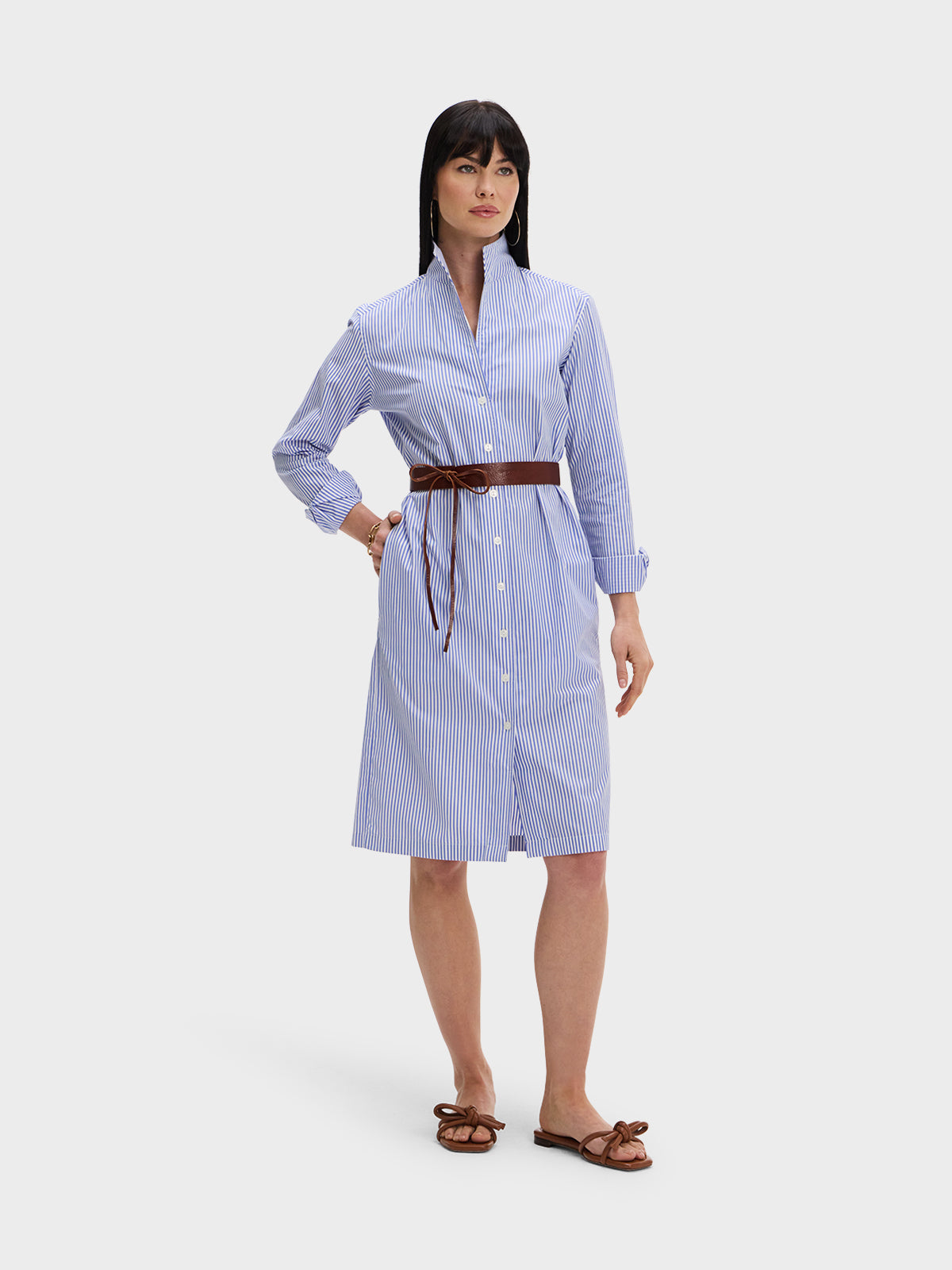 Our one and done Shirt Dress featuring our Signature collar in a blue and white stripe broadcloth.