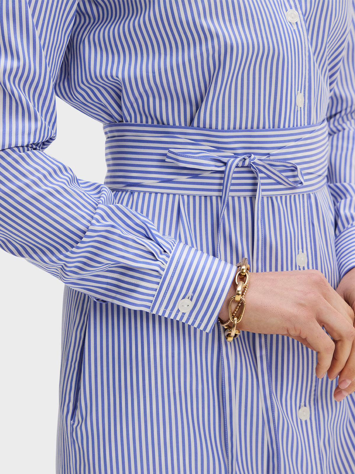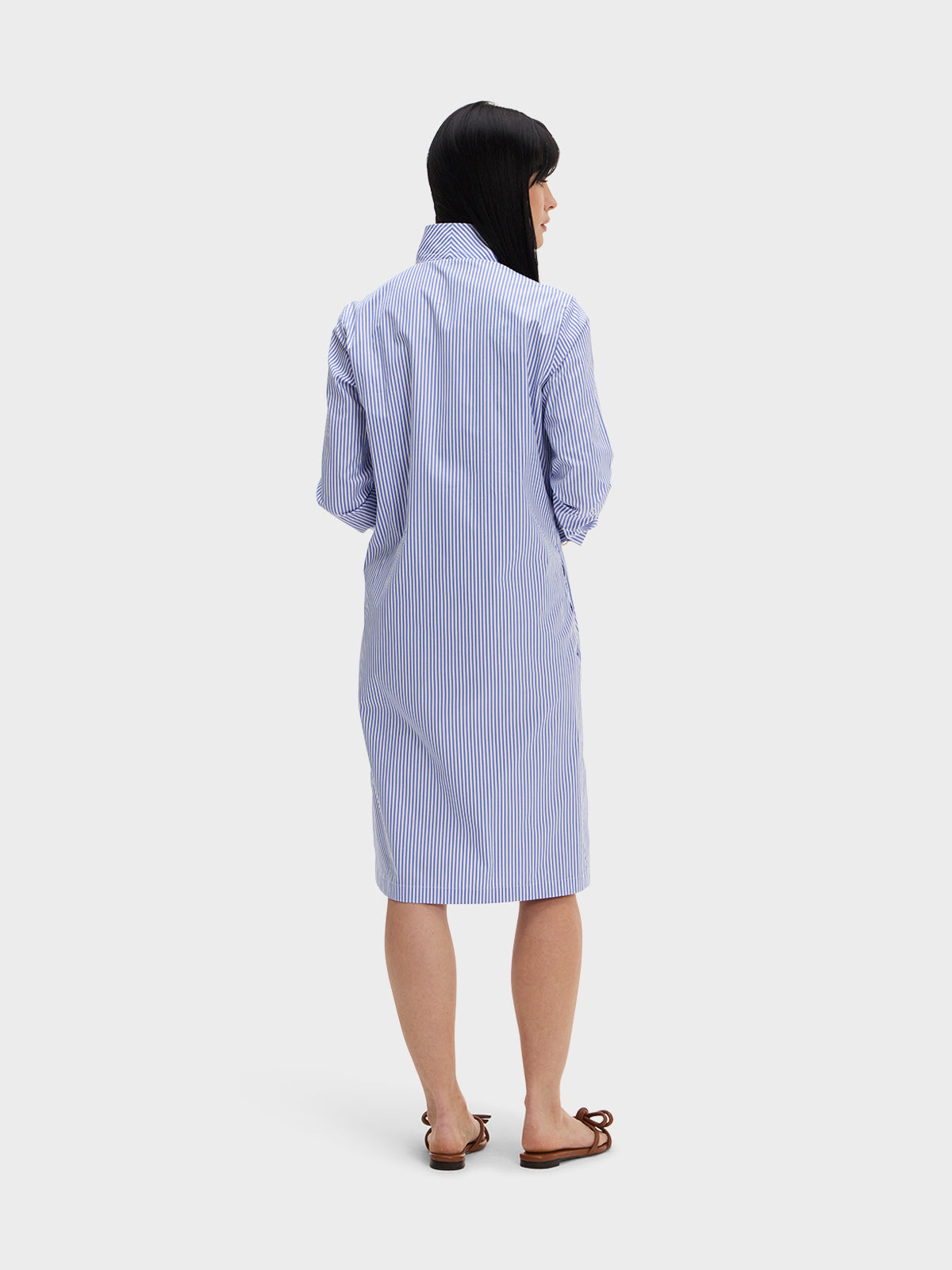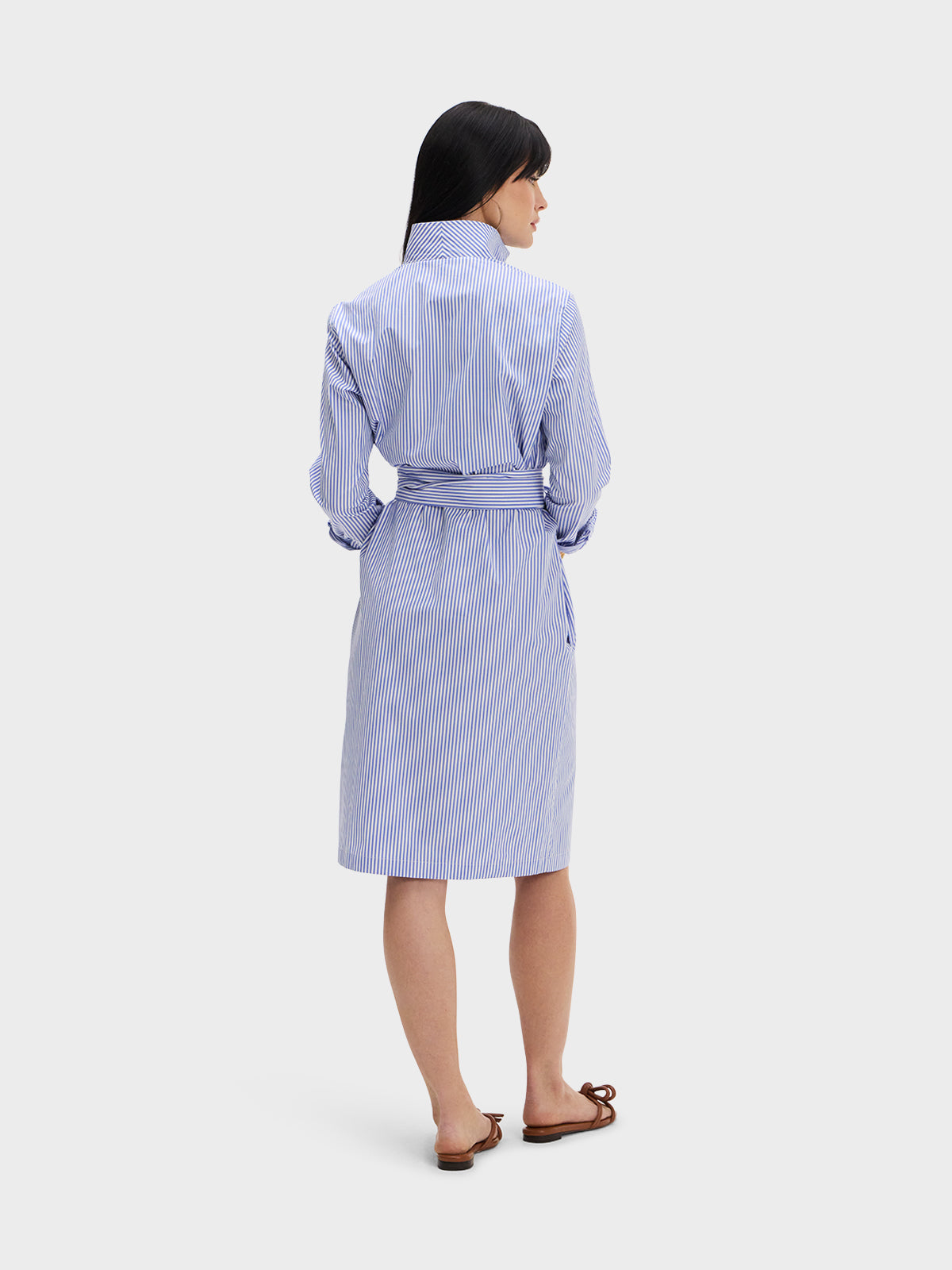 Our one and done Shirt Dress featuring our Signature collar in a blue and white stripe broadcloth.