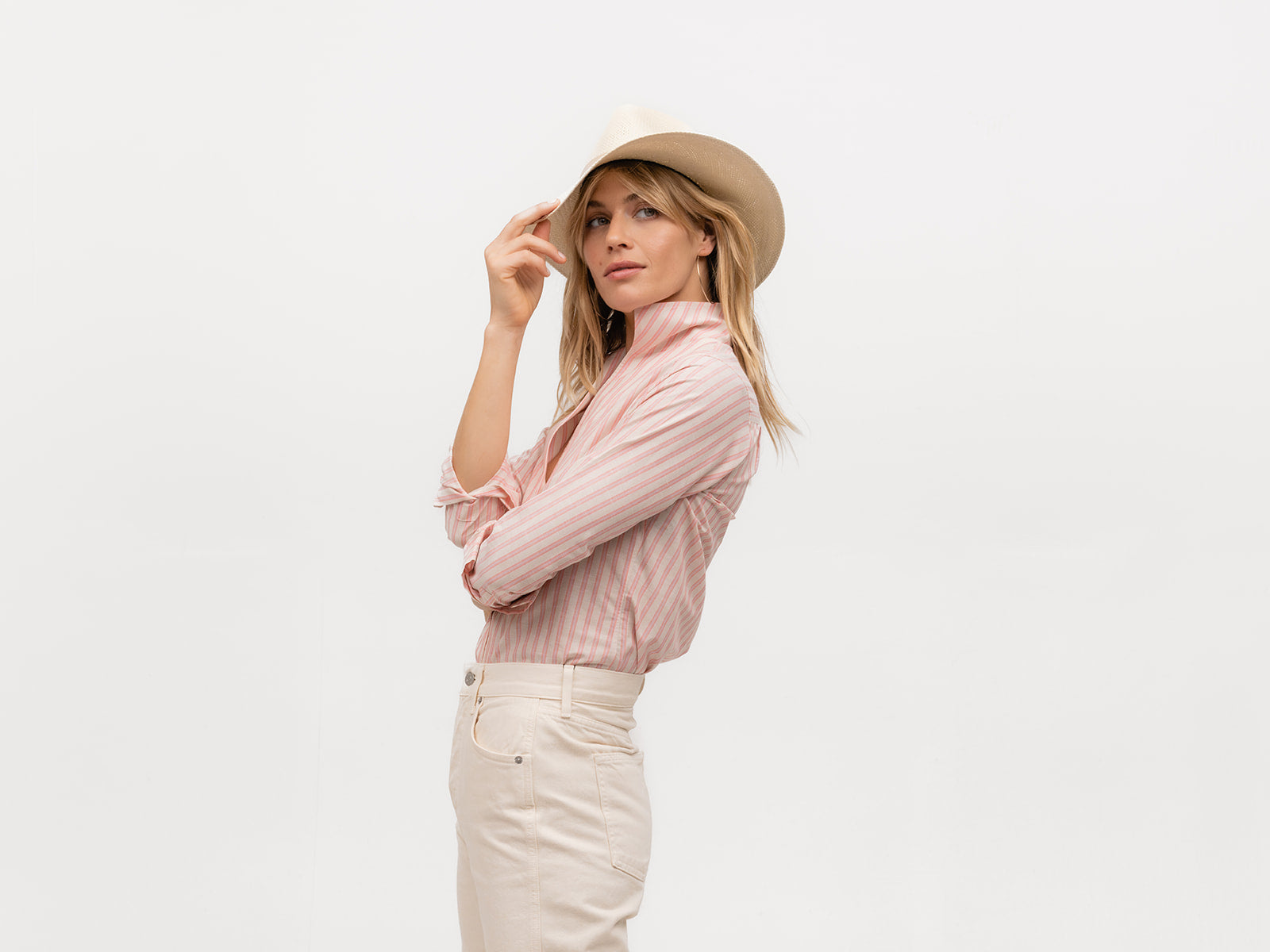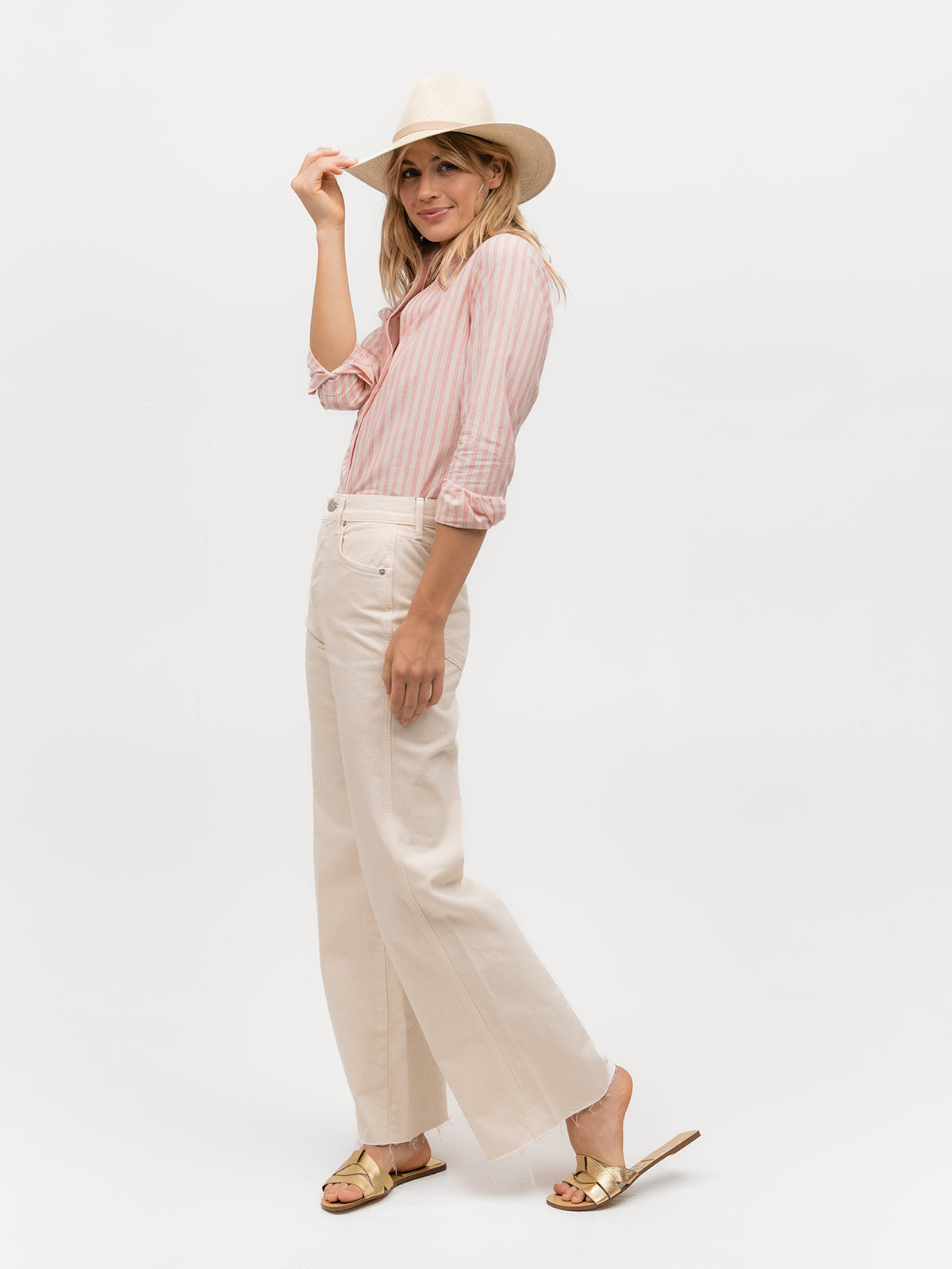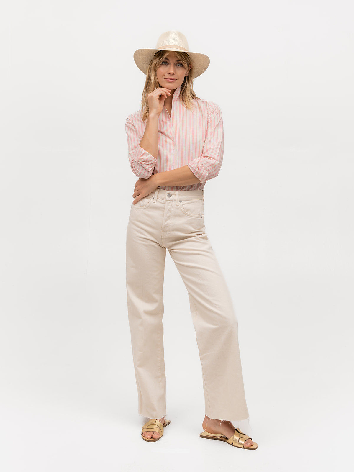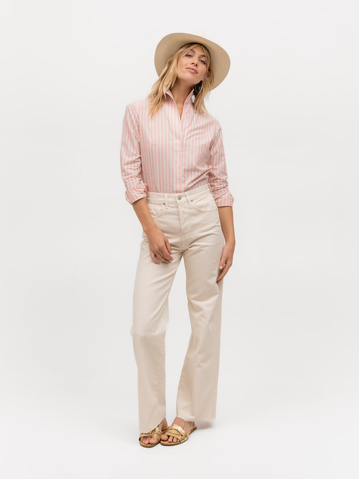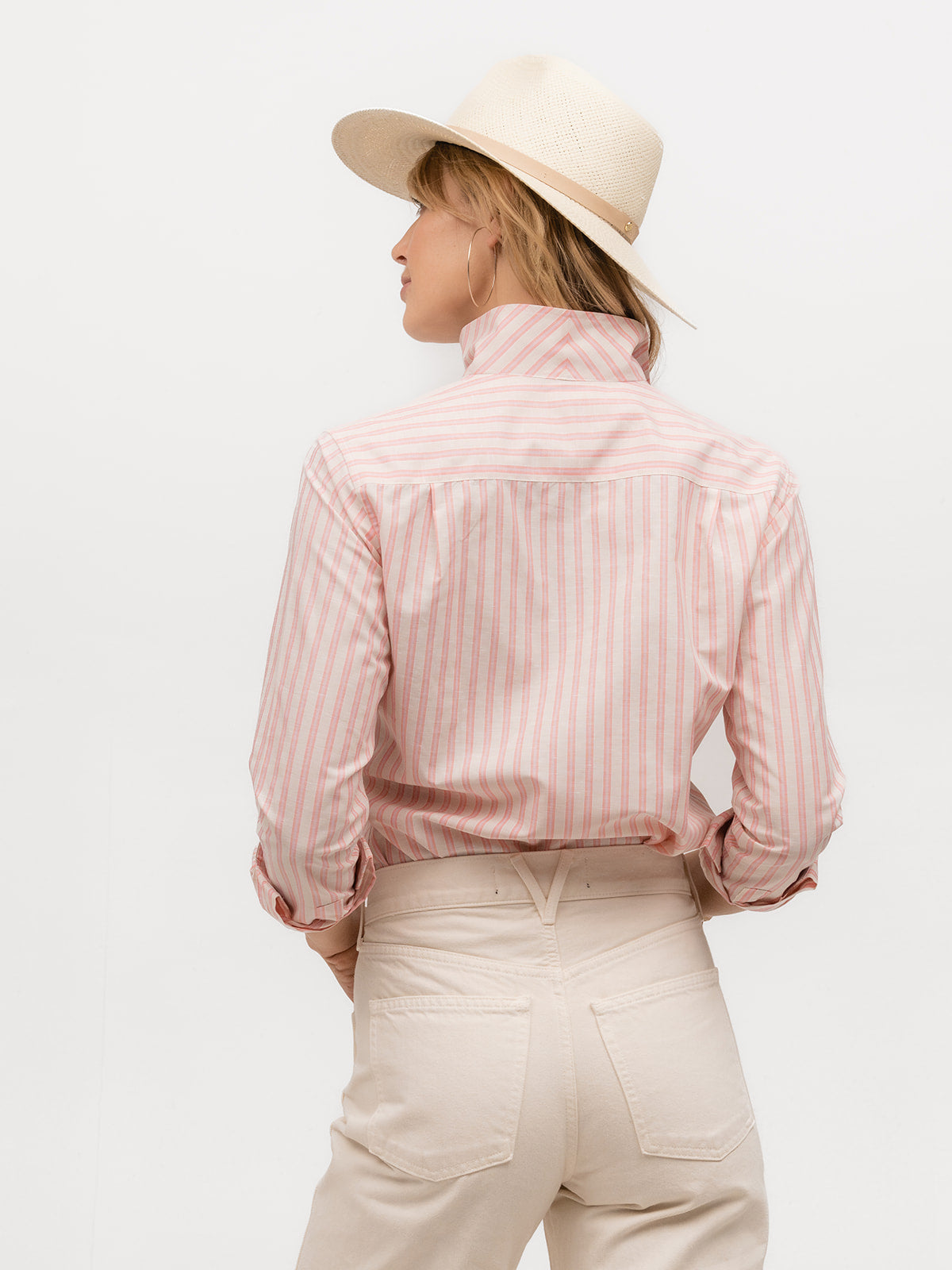Our best-selling Signature Shirt in a sweet khaki and neon pink uneven stripe cotton/linen blend.
