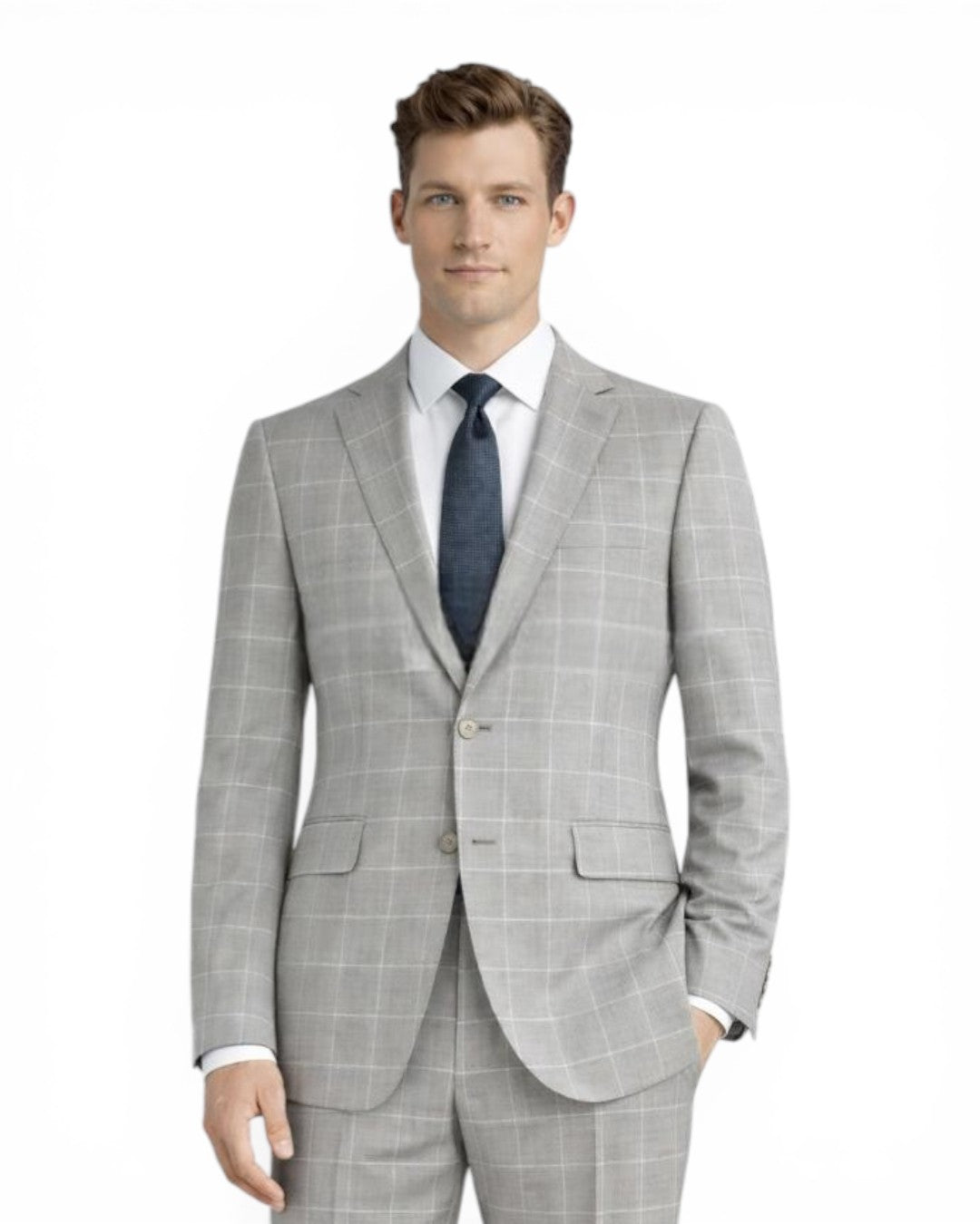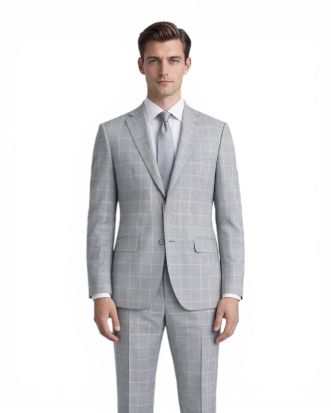 Button Vested No Pleat Suit - Light Grey Windowpane