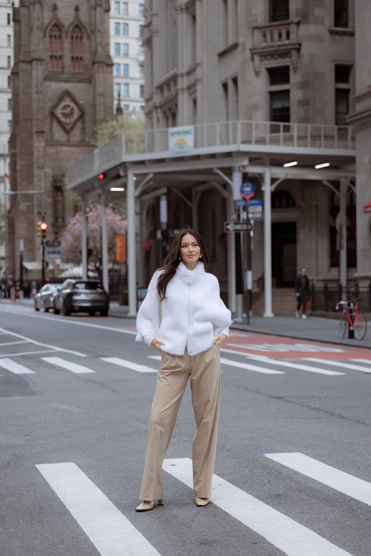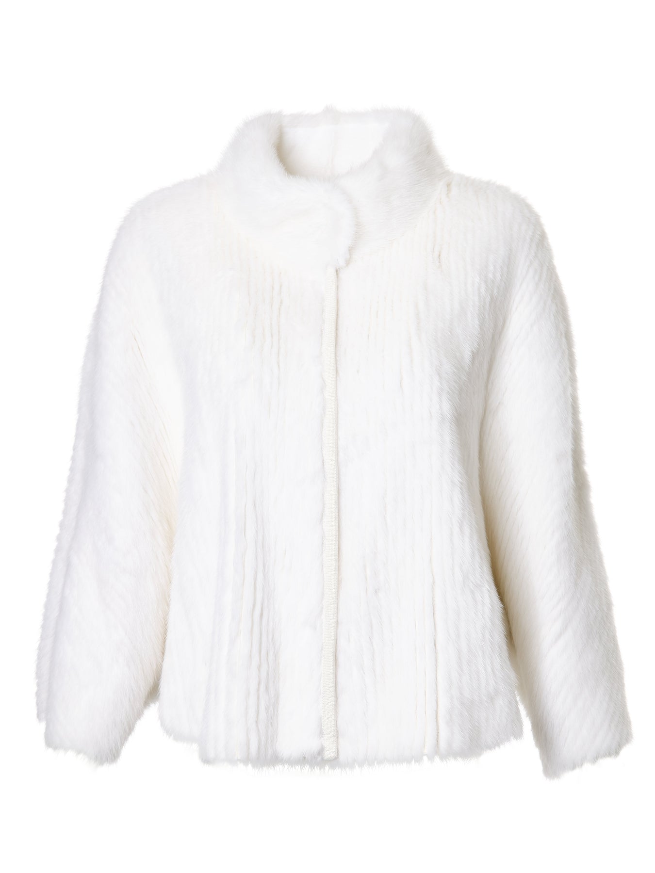 A loose-fitting jacket featuring a concealed snap button closure. This stylish piece is crafted from mink and offers a comfortable cashmere blend lining.