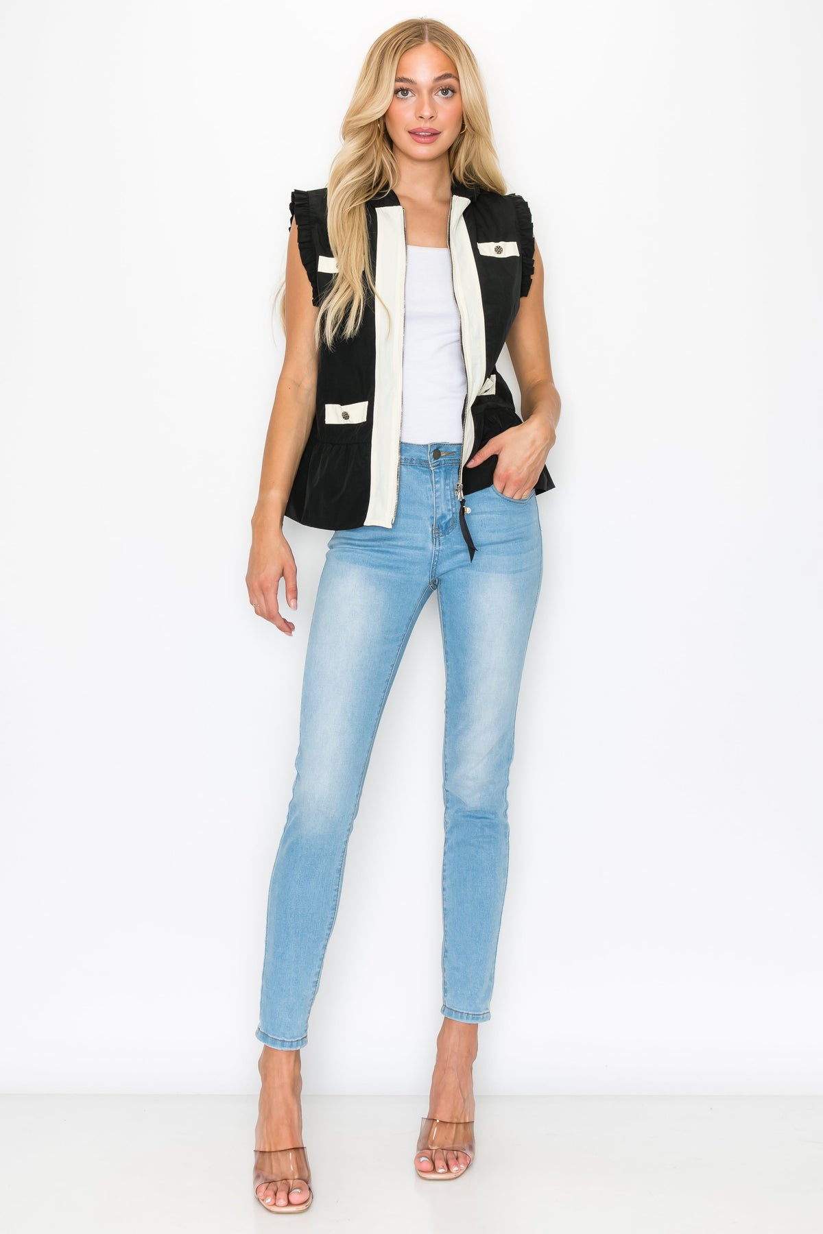 The Josie vest. Made with lightweight parachute-like woven fabric. Front zipper with ribbon bow, colorblock, and hoodie. Perfect everyday wear. Easy relax fit. Stylish and comfort.