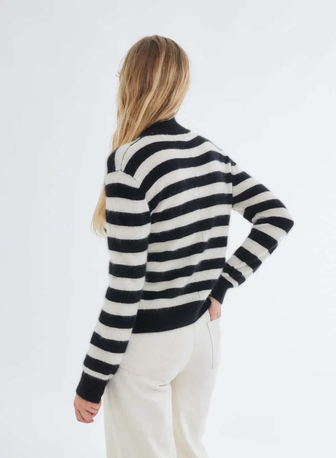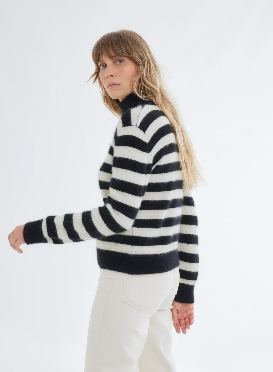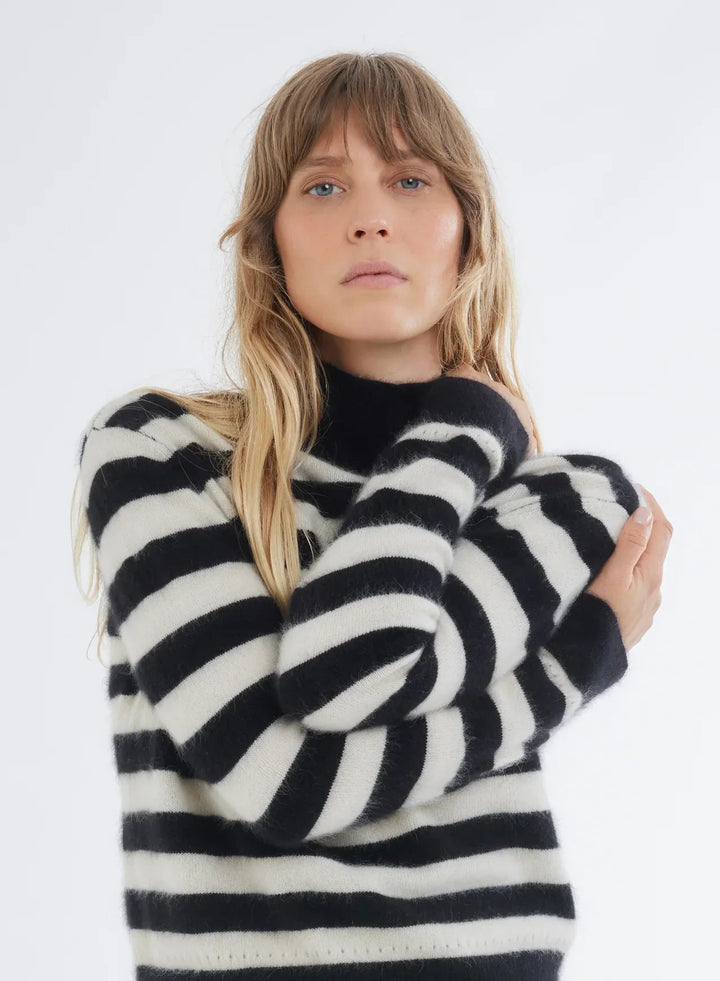 This ultra soft novelty stripe mock neck pullover sweater is designed with a relaxed fit and contrast collar and cuff.   Laser cut details create an elegant edge to a timeless silhouette.