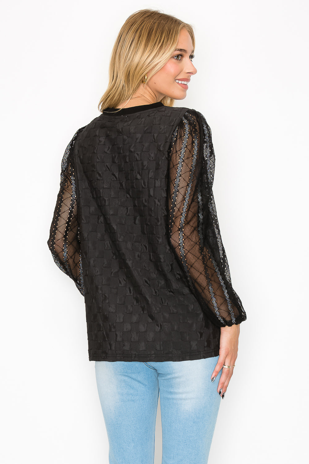 Connie Textured Woven Top with Stretch Mesh Lace