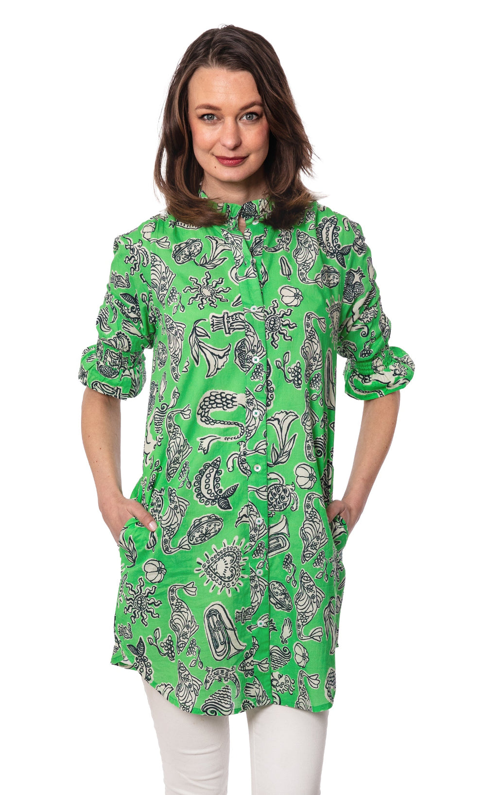 Big Shirt Tunic with Ruffle Green Whimsy Print