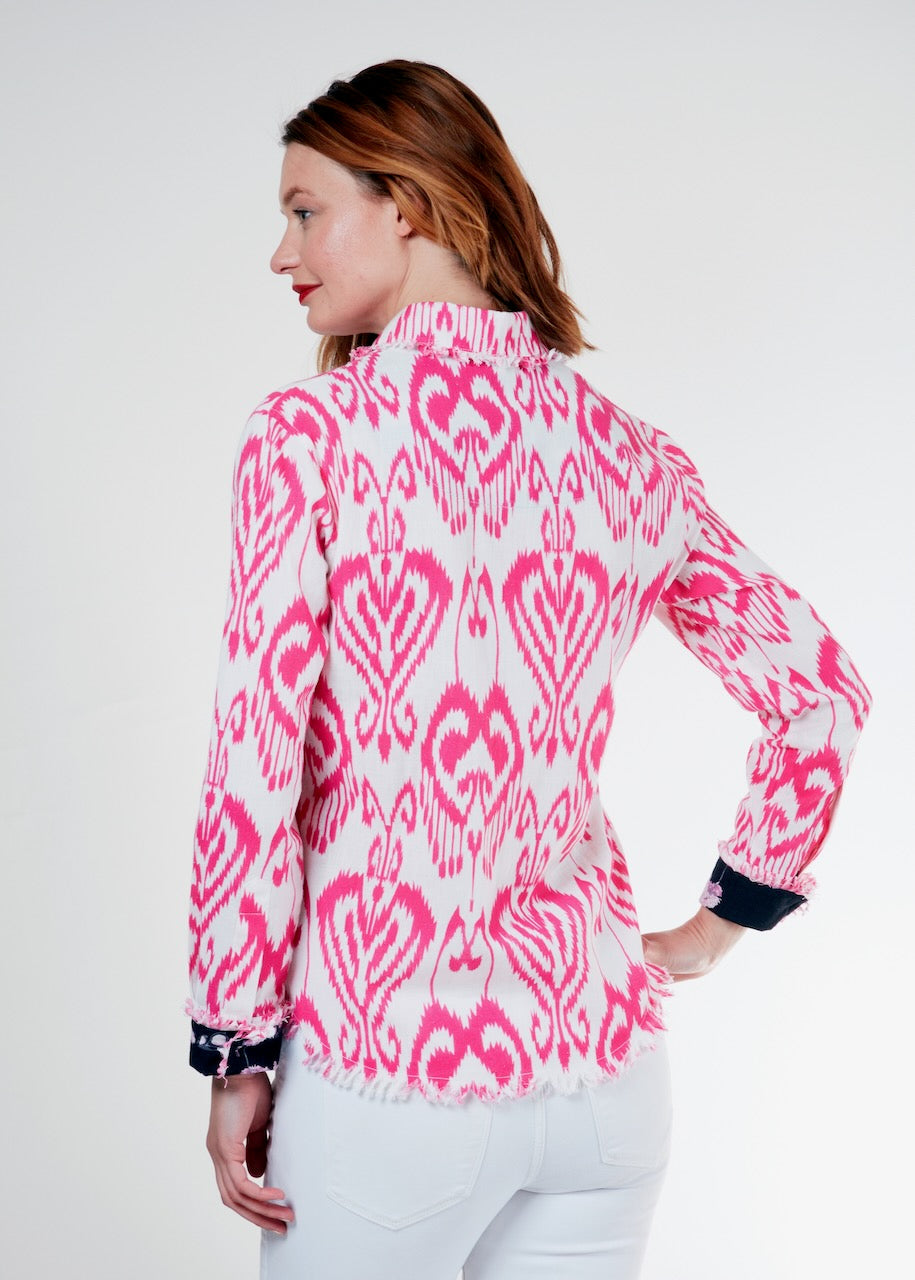 The Cape Cod tunic with it's fringes and contrast cuffs looks amazing in hot pink and white ikat cotton linen. It's a summer classic. You will light up the room . Great with white jeans !