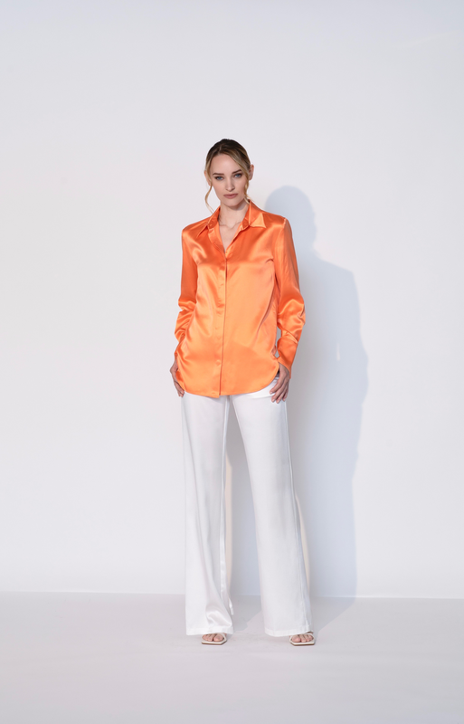 Introducing the Silk Button Down Shirt in Pinata Orange, a statement piece designed for the discerning fashionista. Crafted from the finest silk, this shirt drapes elegantly over the body, providing both comfort and sophistication. The vibrant Pinata Orange hue adds a striking pop of color to any ensemble, making it perfect for both daytime outings and evening soirées.